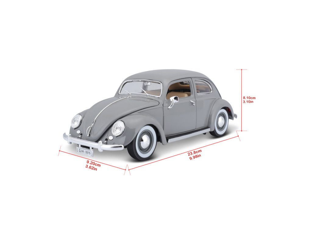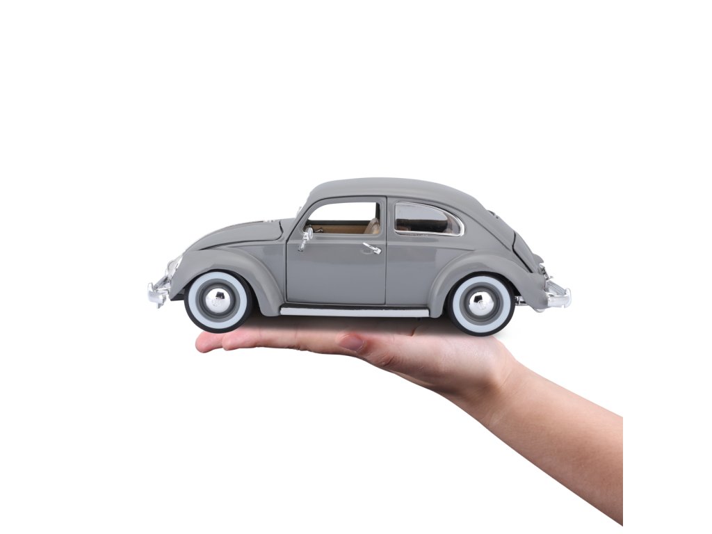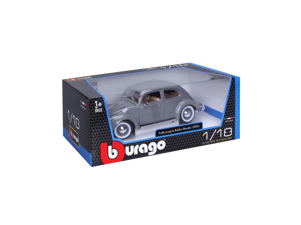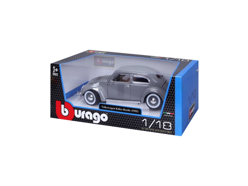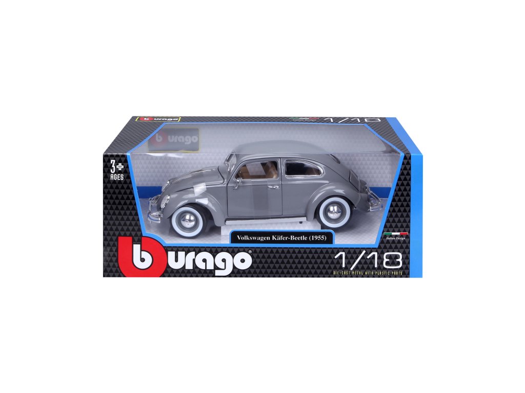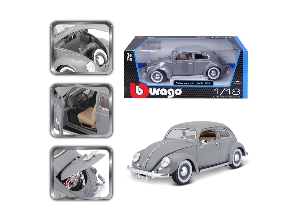 Špičkový model auta Bburago Volkswagen Käfer Beetle rok výroby 1955 v měřítku 1:18. Kolekce Gold. Model má otevírací dveře a kapoty. Volant je funkční. Věk 3+.
