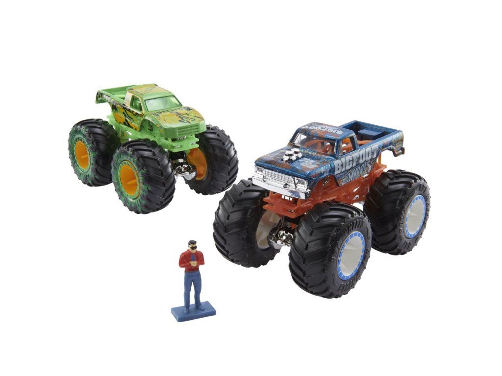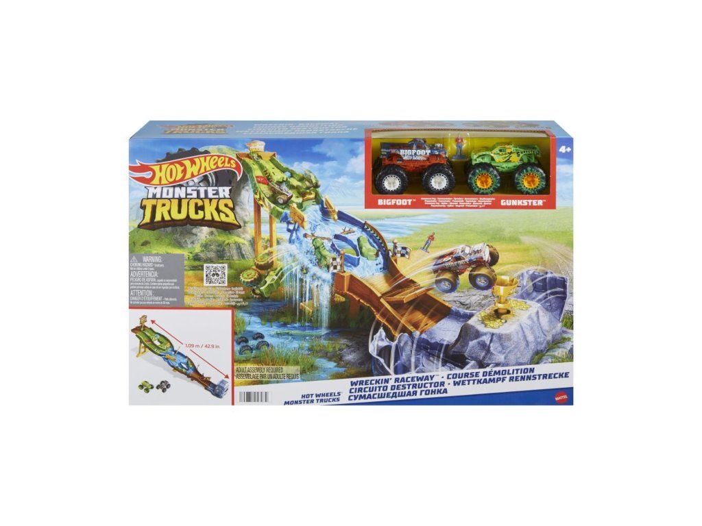 Zjistěte, kdo je nejrychlejší a nejodolnější monster truck, když se utkají v Hot Wheels® Monster Trucks Turnaj Titánů™! Inspirováno epickými sjezdovými závody ze seriálu "Turnaj Titánů" na YouTube, Bigfoot™ a Gunkster™ se řítí dolů z kopce přes rozdrcená auta a přes řadu překážek, aby se probili jeskyní a získali vytoužený pohár Titánů. První truck, který přejede přes most, spustí "výbuch", který pošle druhé auto a komentátora do vzduchu. Sada se dá složit pro přenášení a snadné uložení. Barvy a vzhled výrobku se mohou lišit.