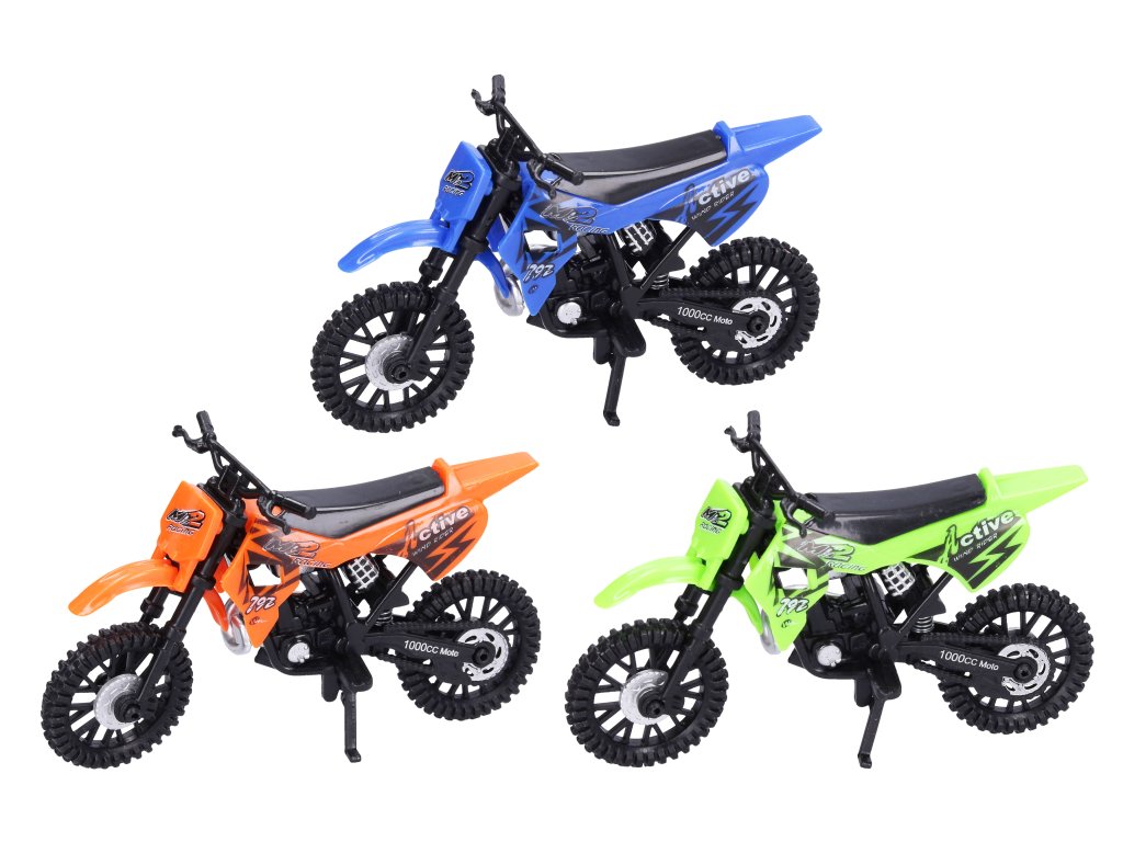 Motorka terénní. Velikost 12x5x8 cm. Volná kola. Display box - 12 ks. 3 varianty - oranžová, zelená, modrá.