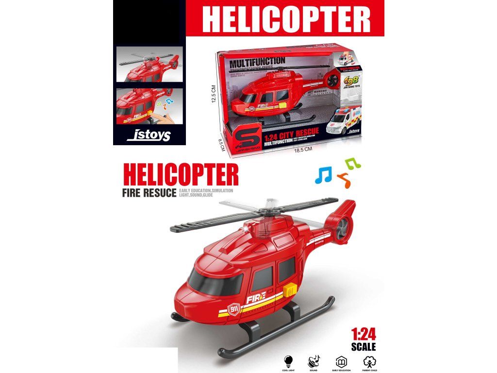 Vrtulník s efekty. Velikost 17 cm. Světelné a zvukové efekty, aktivace tlačítkem na levé straně vrtulníku. 3xAG13 baterie součástí.