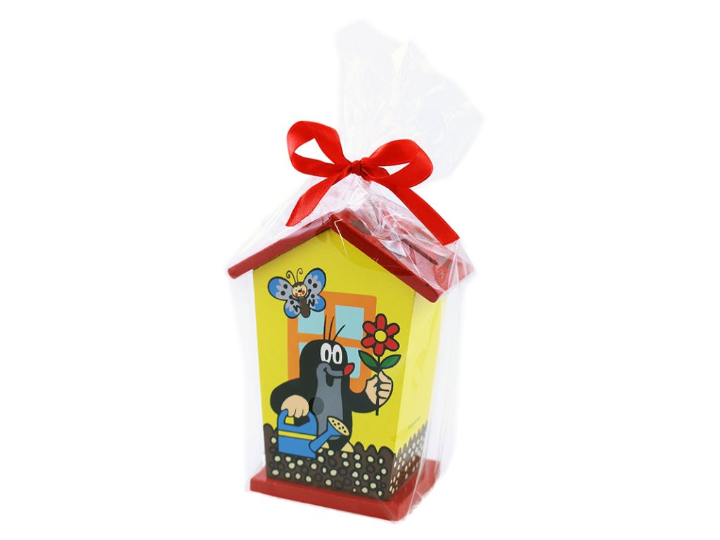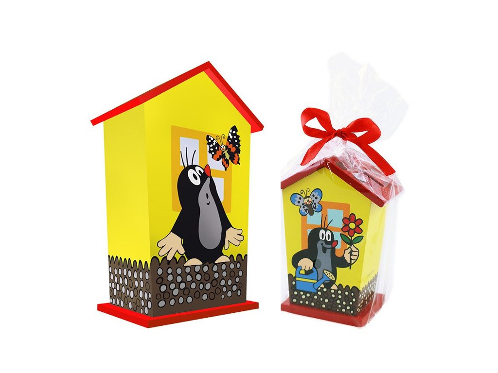 Krásná dřevěná pokladnička s motivem legendárního Krtka na zahrádce. Pokladnička má ve spodní části gumovou zátku a je zabalena v dárkovém balení. Tak šetři s Krtečkem! Rozměr pokladničky je 9 x 12,5 x 6 cm.