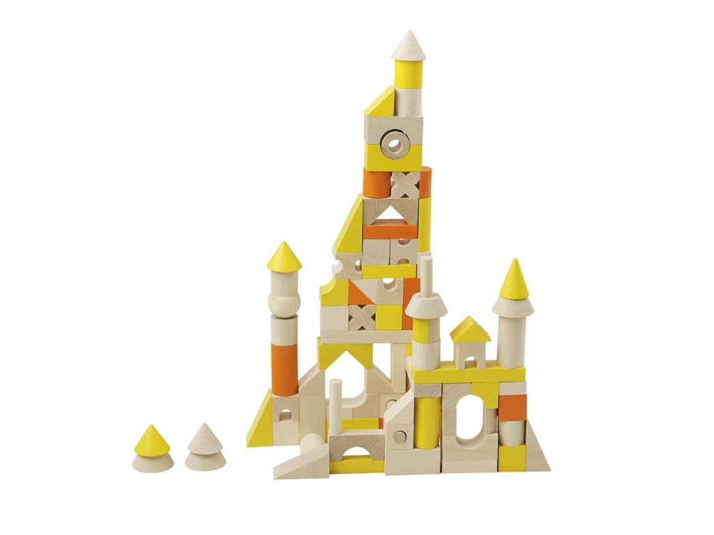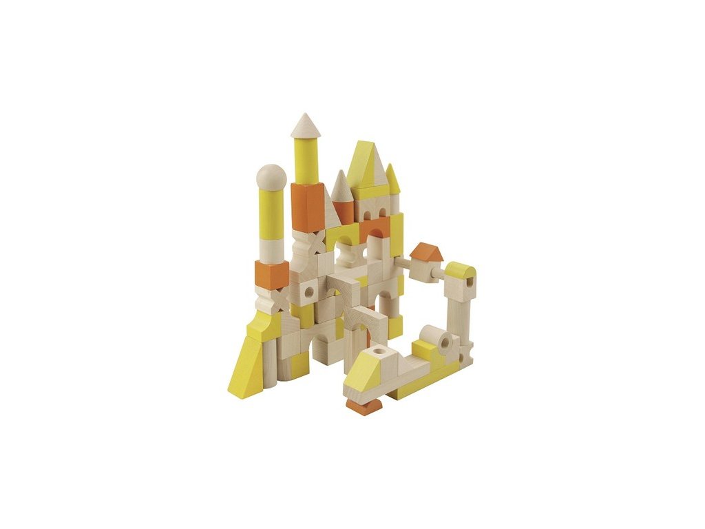 Inovovaná stavebnice skládající se z různých tvarů a velikostí dřevěných dílků v barevném provedení žluto-oranžovém. Kromě klasických krychlí, kvádrů a válečků obsahuje také tyčky, jehlany a další tvary. Některé jsou navíc provrtané. Díky tomu můžete postavit úžasné stavby. Velikost kostky 20mm. Stavebnice obsahuje 96 dílků.