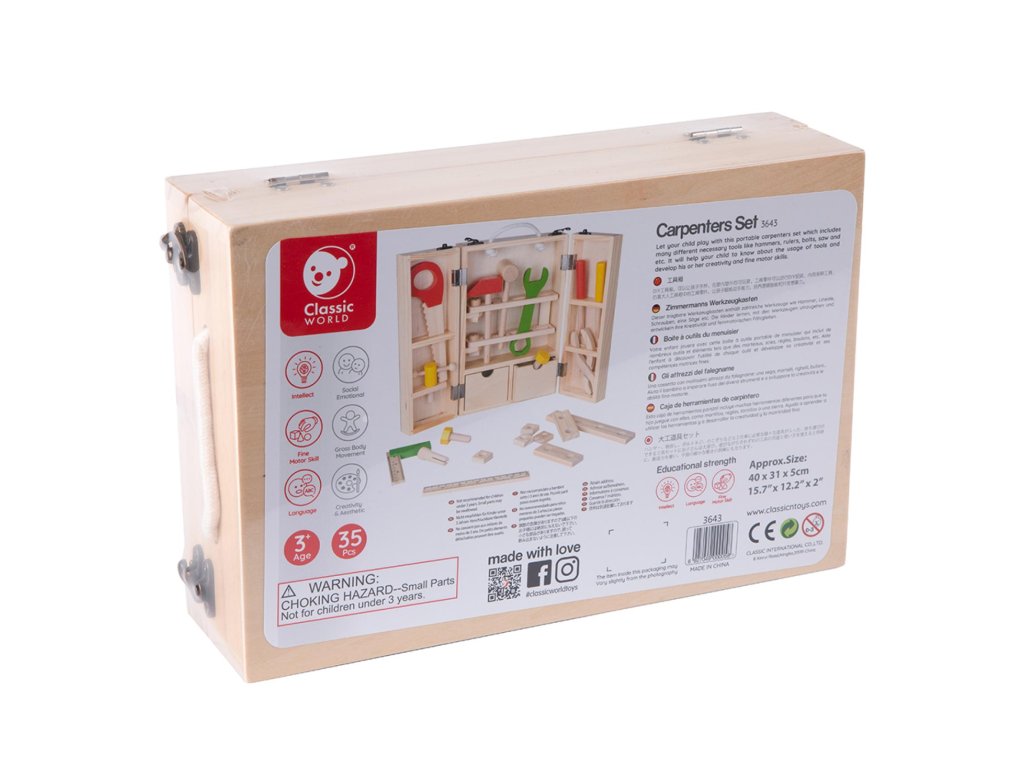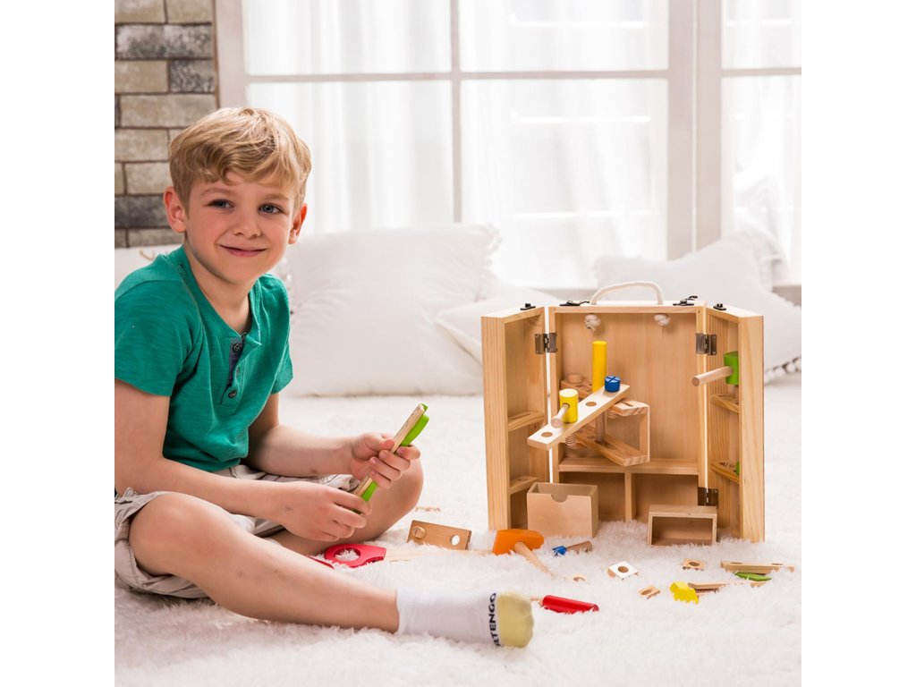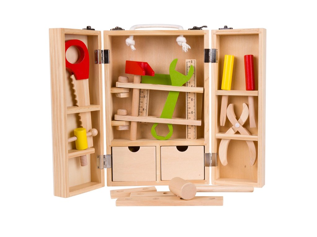V sadě dřevěného nářadí se nachází sada šroubků, matky, hmoždinky, lišty s otvory k montáži, 2 klíče, šroubováky, kladívka, pravítka a pilka. Dítě může libovolně přikrucovat lišty s pomocí klíče a šroubováku. Všechny díly může spolu spojovat pomocí šroubků. Dětské barevné nářadí je vyrobeno z vysoce kvalitního a bezpečného materiálu.