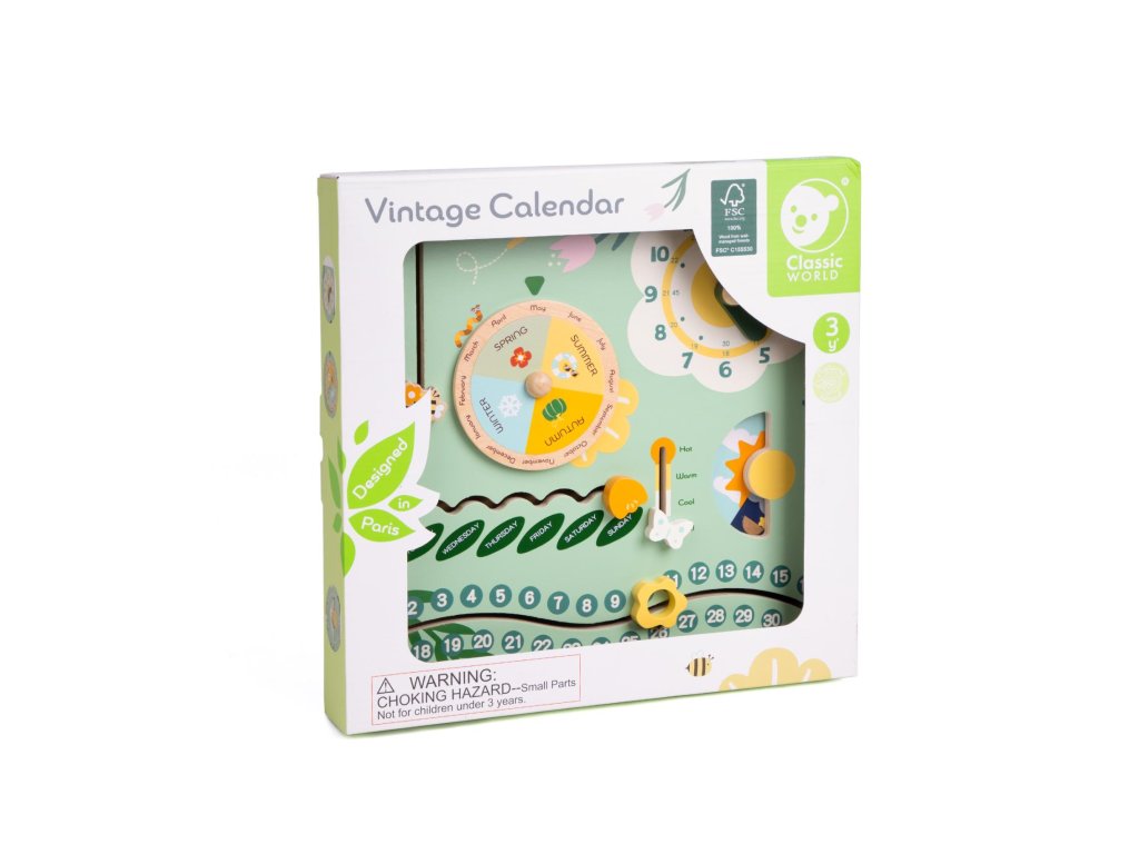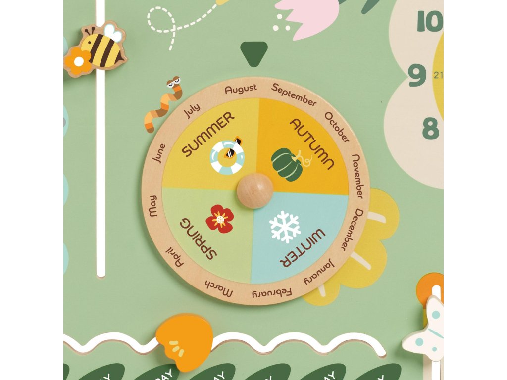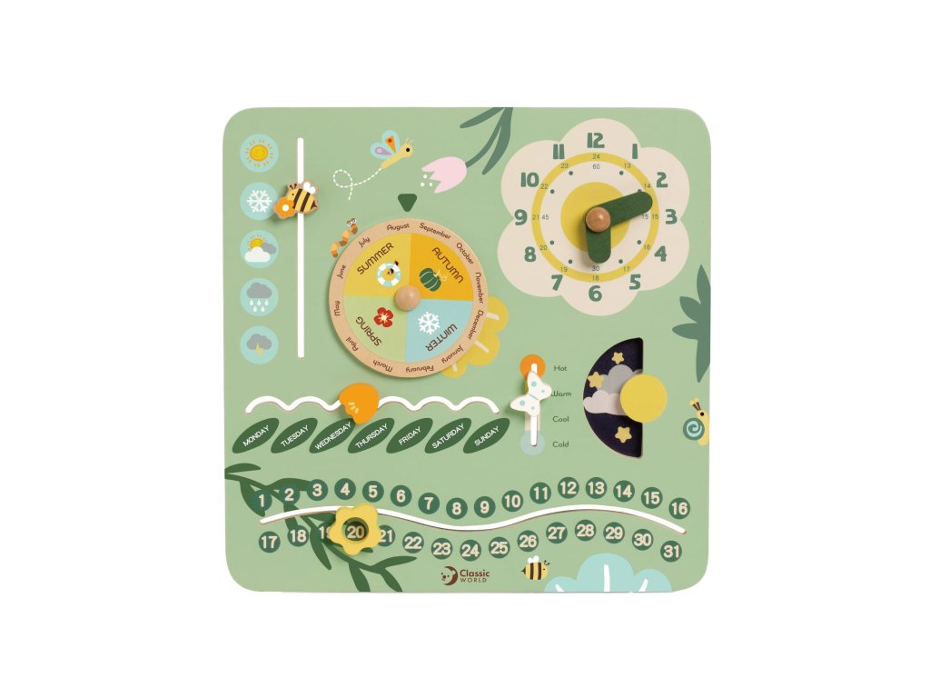 Stylový dřevěný kalendář v anglickém jazyce je skvělým pomocníkem pro výuku času, ročních období, dnů v týdnu i základních anglických slovíček. Děti si mohou každý den samy nastavit datum, měsíc, počasí nebo den v týdnu pomocí otočných a posuvných prvků. Barevné provedení je přehledné a zábavné, ideální pro domácí učení i do školky. Hračka rozvíjí slovní zásobu, orientaci v čase i samostatnost. Velikost balení: 31 cm x 31 cm x 5cm. Vhodné pro děti od 3 let.