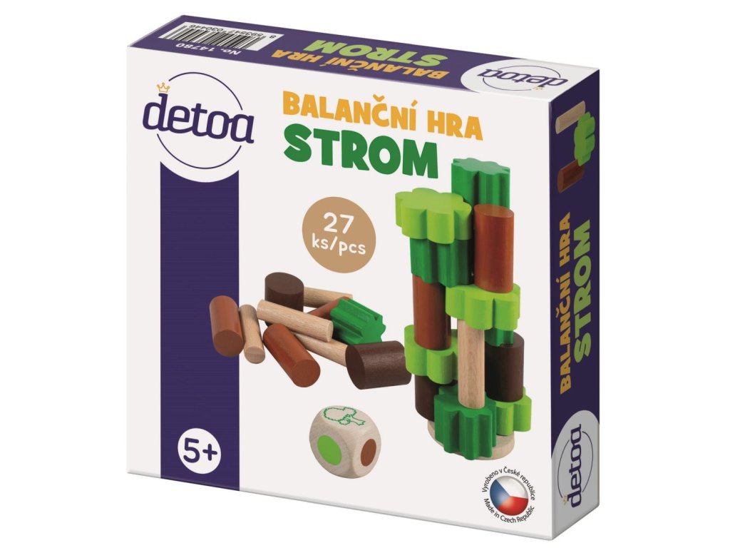 Balanční hra Strom, slouží k rozvoji jemné motoriky rukou. Barva na kostce určuje barvu dílku, který musí hráč umístit na hrací plochu. Hra pokračuje, dokud strom nebude plně postavený nebo se rozpadne jednomu z hráčů pod rukama. Hra je určená pro 1 - 6 hráčů. Rozměry výrobku jsou 152 x 35 x 152 mm.