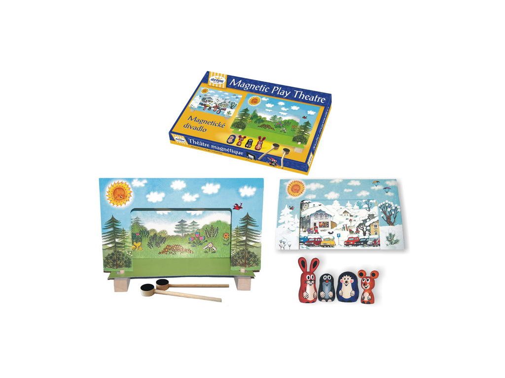 Magnetické divadlo Krtečka a jeho kamarádů obsahuje podstavce, dvoje kulisy z tvrdého papíru, dvoje vodící hůlky a 5 dřevěných figurek. Baleno v krabici z tvrdého papíru. Nevhodné pro děti do 3 let. Obsahuje malé části. Výrobek je zdravotně nezávadný.