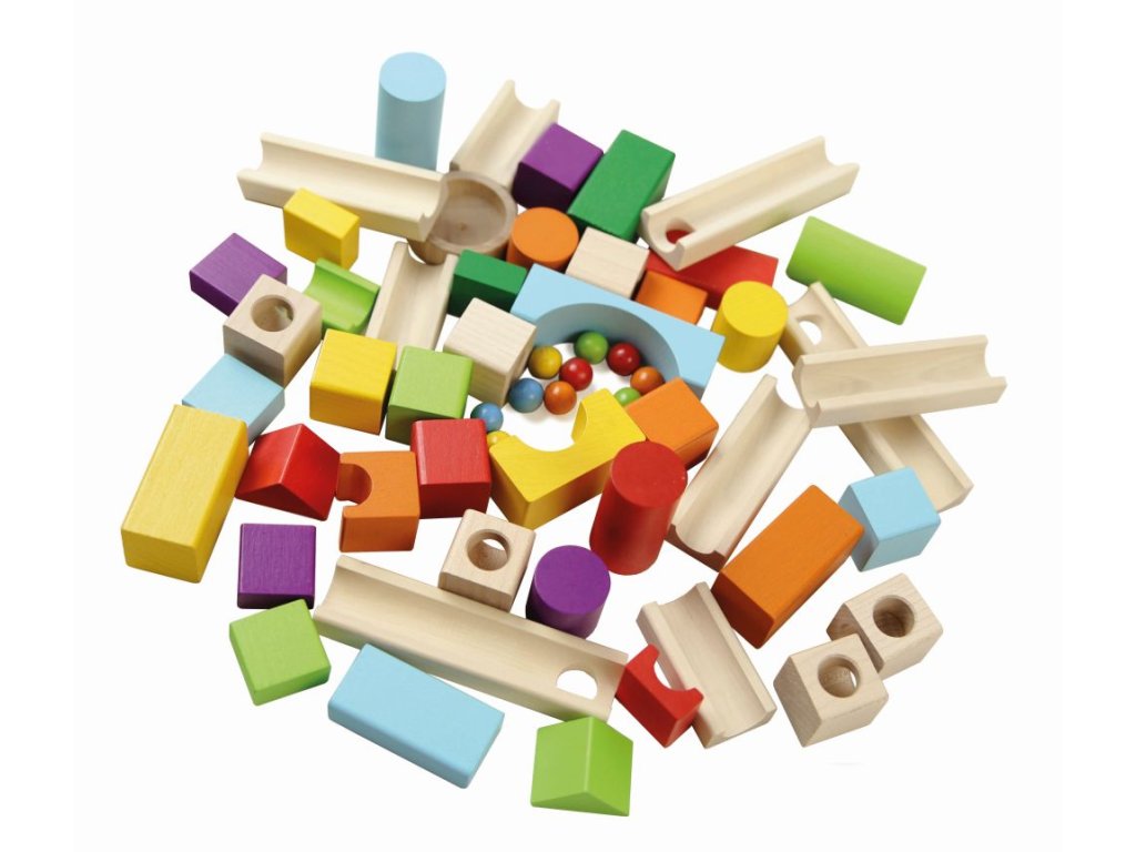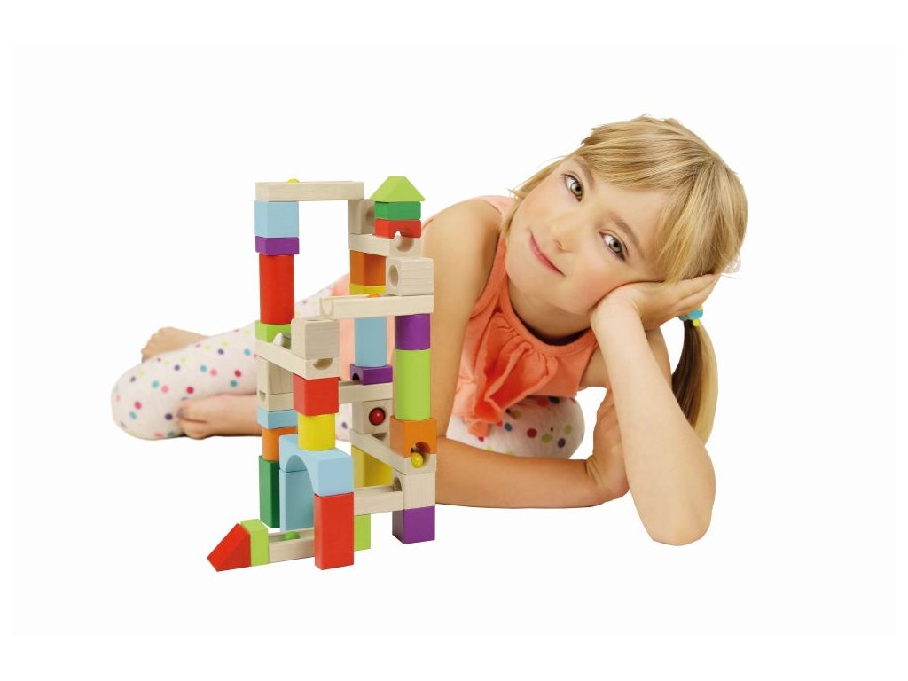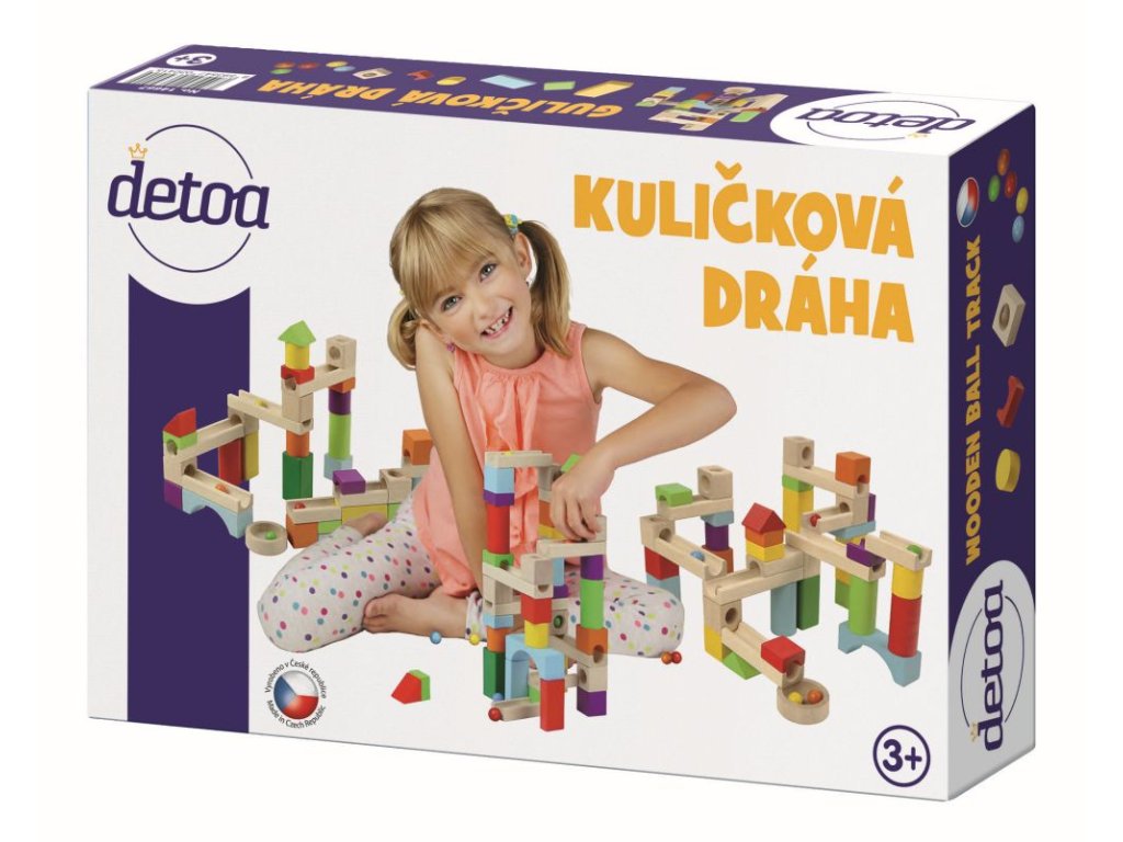 Dřevěná dráha se skládá z dřevěných dílků různých tvarů, barev a velikostí. Základní velikost krychle je 27 mm a O kuličky je 13 mm. Stavebnice rozvíjí motoriku rukou, kreativitu, fantazii a logické myšlení dětí. Výrobek splňuje požadavky EU na bezpečnost hraček.