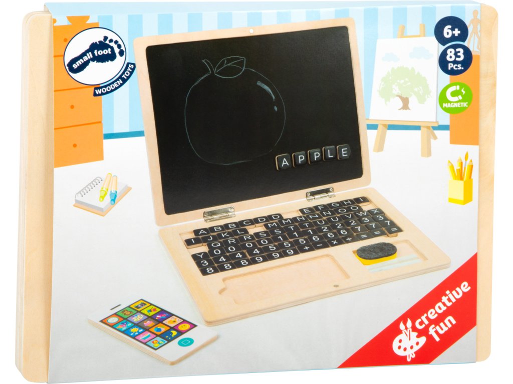 Pište na klávesnici stejně jako dospělí! S tímto dřevěným notebookem můžou mladí počítačoví nadšenci získat první zkušenosti s IT. Dílky s písmenky, čísly a znaky mohou děti jednoduše přesouvat a vytvářet tak slova nebo řešit matematické problémy a to na magnetické destičce – displeji notebooku. Křídou pak děti mohou kreslit obrázky nebo psát slova, které jednoduše smyjí houbičkou. V balení je také dřevěný smartfon. Notebook lze jednoduše přemísťovat a přepravovat díky jeho kompaktní velikosti. Balení obsahuje 83 dílků.