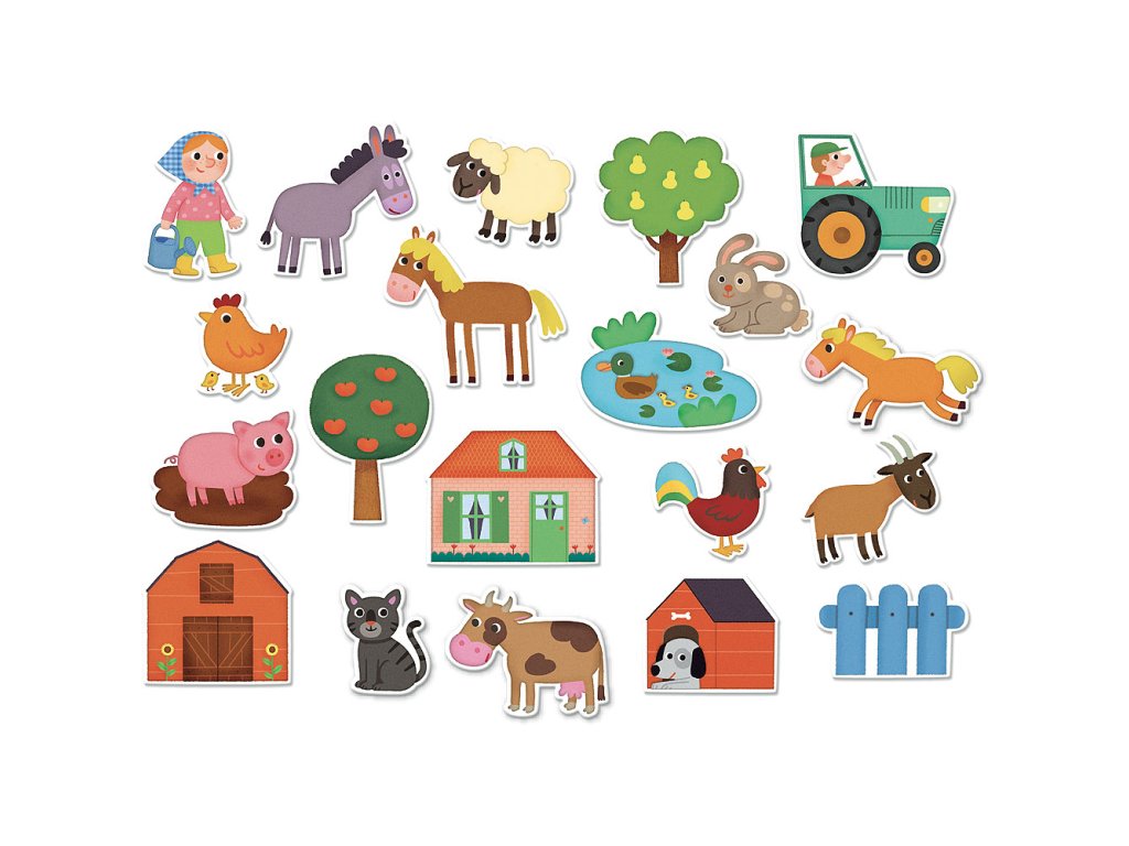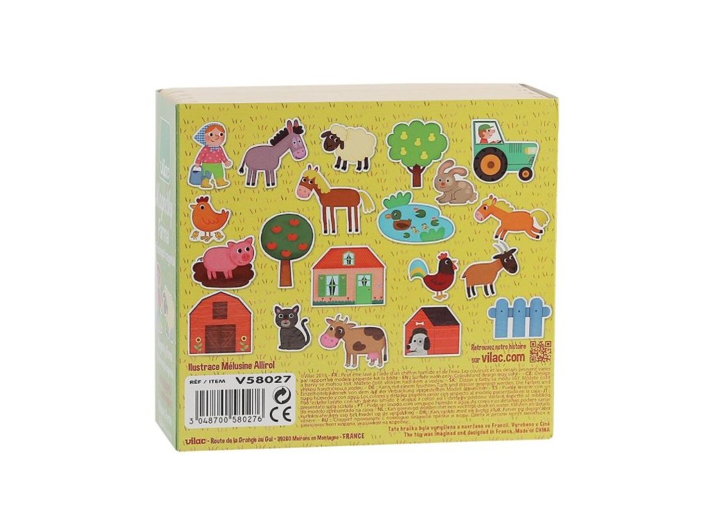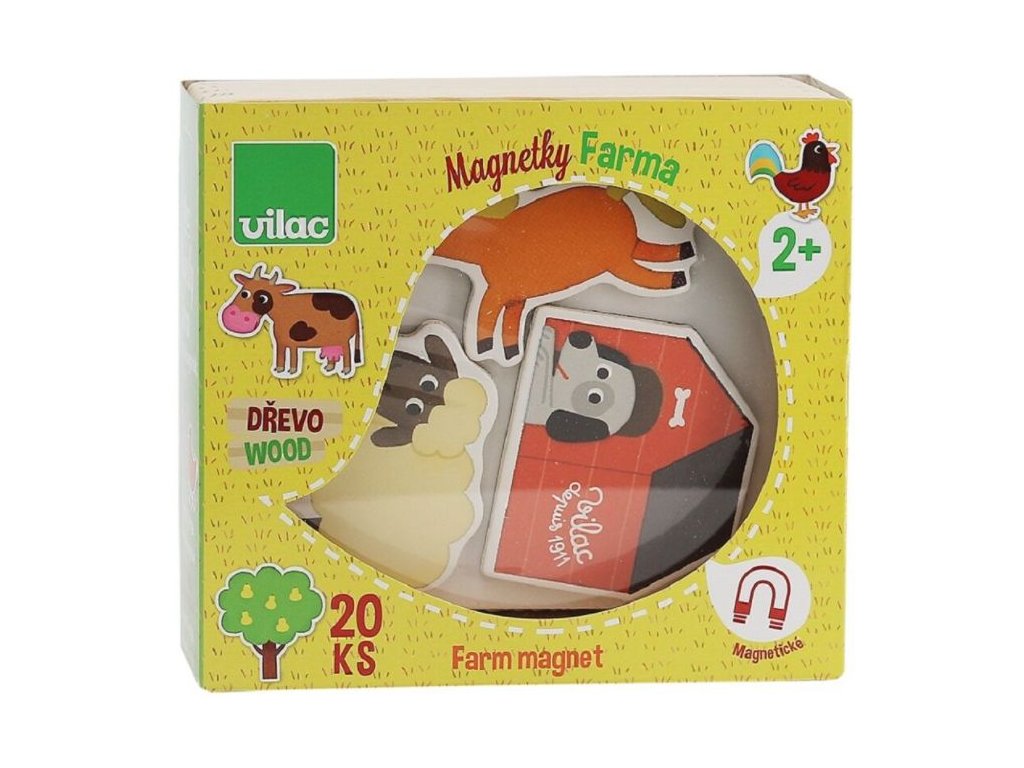 Rozměry hříběte: 8,5x5,5x0,3 cm, boudy s pejskem: 6x6,5x0,3 cm, ovečky: 6,5x5,5x0,3 cm. Bestseller naší nabídky. Dvacet dřevěných magnetů s tematikou farmy uvede Vaše děti do života se zvířaty na venkově. Hračky Vilac mají značku francouzské agentury ADEME, to znamená, že tyto dřevěné hračky jsou vyráběny ekologicky. Šetří životní prostředí, neznečišťují půdu, vodu a vzduch, neplýtvají energiemi.