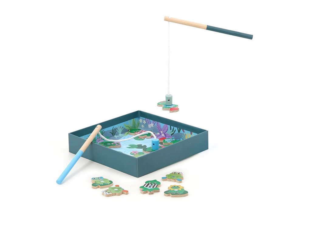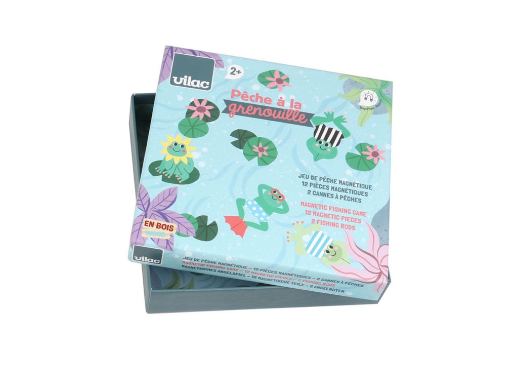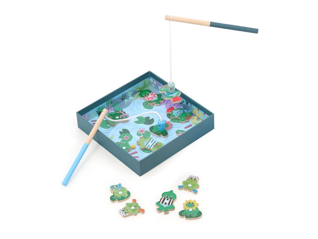 Rybaření s rybičkami? To umí každý. Buďte originální a naučte se rybařit s žabkami od ilustrátorky Michelle Carlsund. K dispozici je celkem 12 roztomilých žab, každá v jiném tvaru i barevném designu. Chyťte je všechny! Každá žabka má na zadní straně různý počet teček, které označují body. Při hře tedy nezáleží na tom, kolik žab hráč vytáhne, ale nakonec se na již vytažených žabkách spočítají body a vyhrává ten, kdo má bodů více. Hra stimuluje kognitivní vývoj vašeho dítka. Rozvíjí koordinaci ruka-oko a jemnou motoriku. Podporuje také smyslové a vzdělávací učení. Žabky jsou uloženy v krabičce, která se otevřením přemění na herní základnu. Hra obsahuje: 12 dřevěných magnetických žab, 2 dřevěné pruty s magnetem a 1 herní krabičku/základnu Hlavní vlastnosti:•klasická hra v inovativním designu•inspirováno Montessori hračkami•rozvíjí soustředění a trpělivost•napomáhá učení počítání a zapamatování si•učí o barvách a tvarech•úložná krabička, která se přemění na herní základnu•vhodné od 2 let