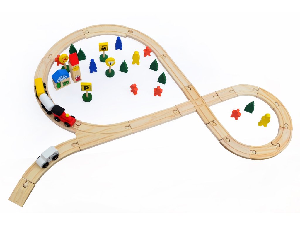 Vlaková dráha set dřevo 48ks. Obsahuje dřevěné koleje, figurky, vláček s vagónky připojitelné pomocí magnetu, auto, budovu, dopravní značky.