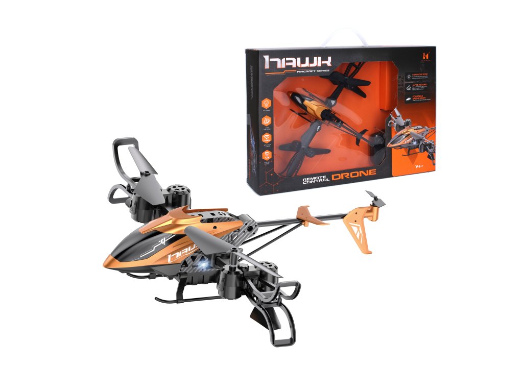 Vrtulník se sklopnými křídly RC na dálkové ovládání. Rozměry 26x32x7 cm. Délka 26 cm, rozpětí křídel 32 cm. Frekvence 2.4 GHz. Sklopná křídla, přemet o 360 stupňů, nastavení rychlosti, vzlet a přistání tlačítkem, navrácení do výchozího bodu. Světelné efekty. Bateriový pack 3.7V 580mAh do vrtulníku součástí, 3xAA do ovladače nejsou součástí. USB kabel a náhradní křídla součástí. Přepínač ON/OFF na boční straně vrtulníku a na ovladači. Nabíjení 80-100 min, dosah 50 m.