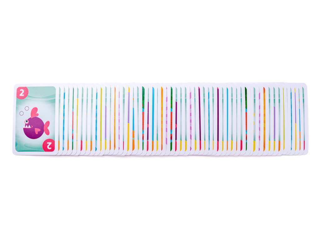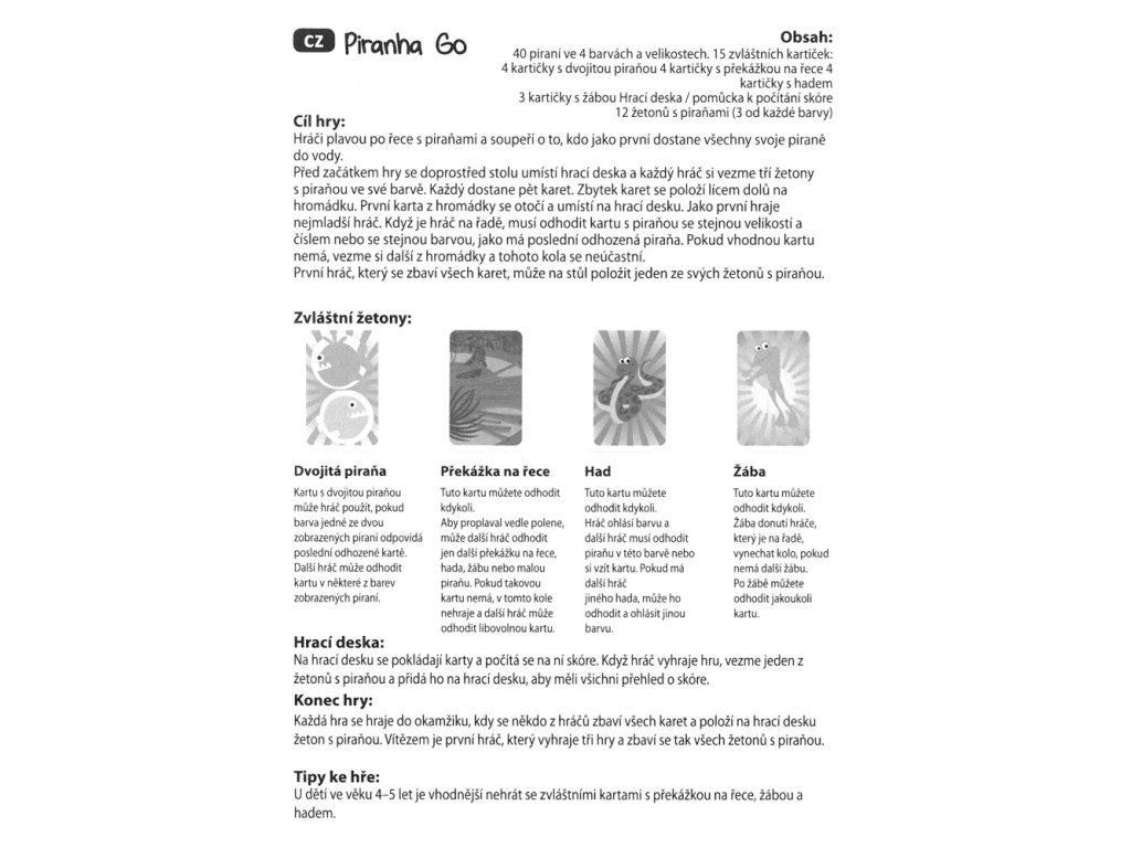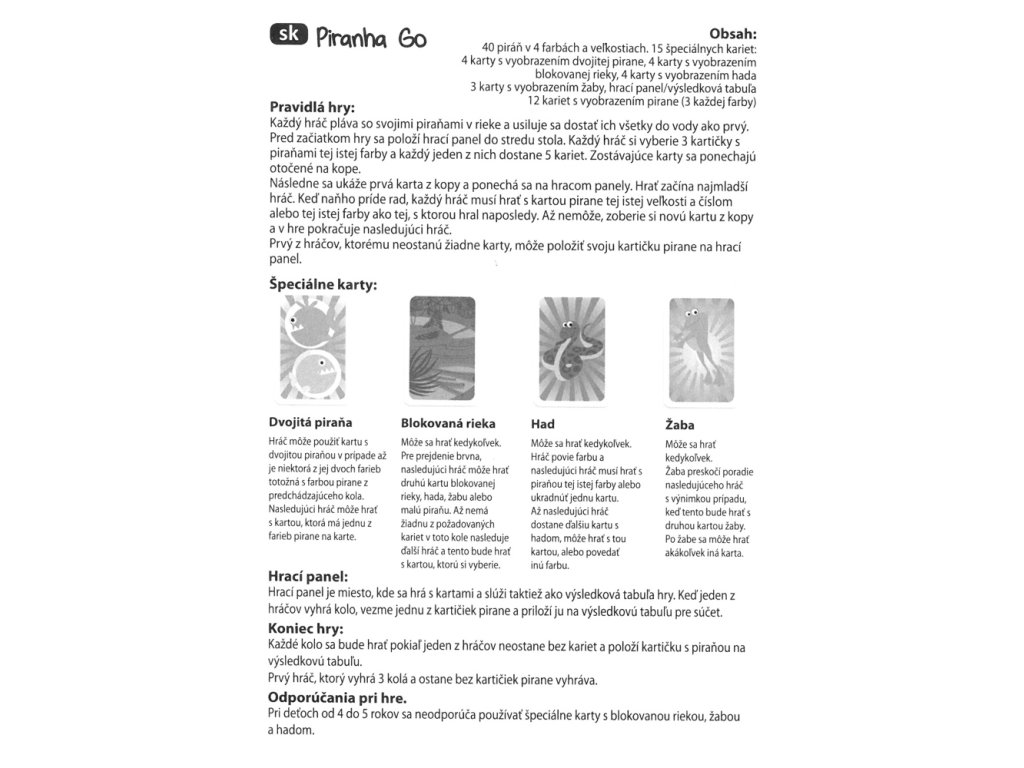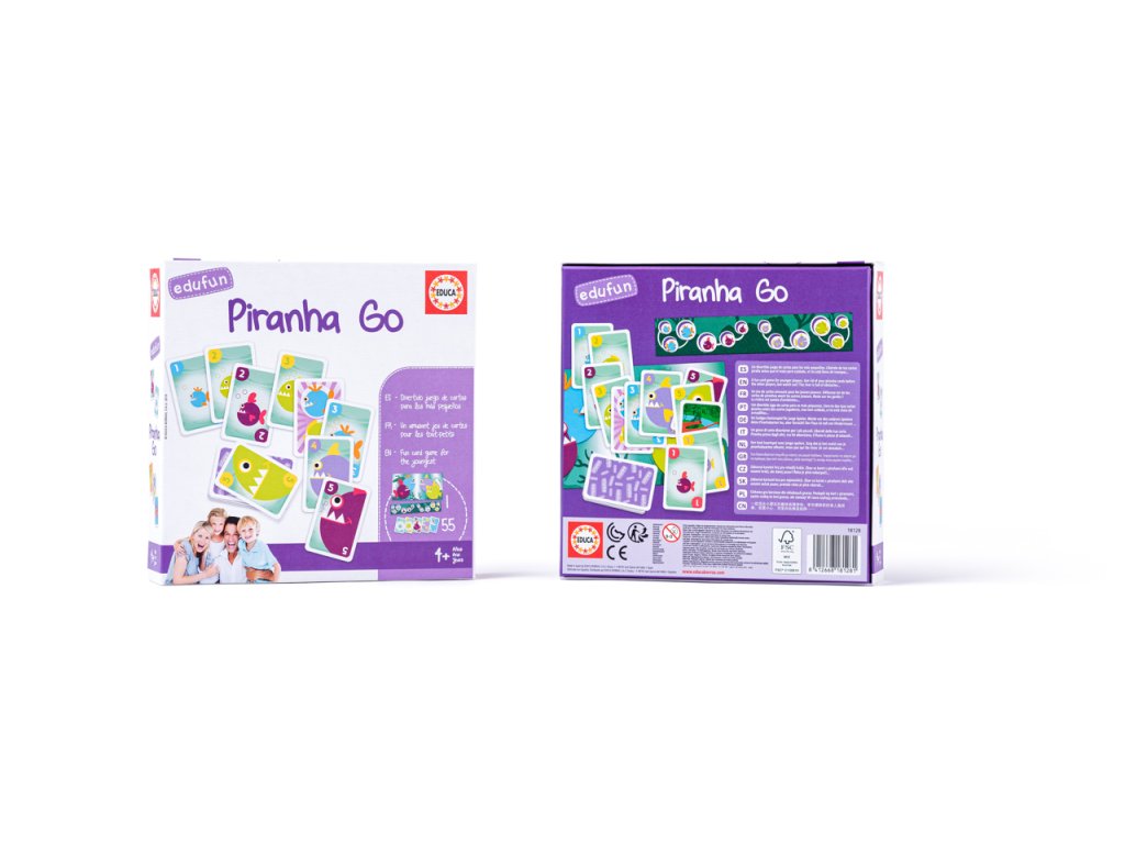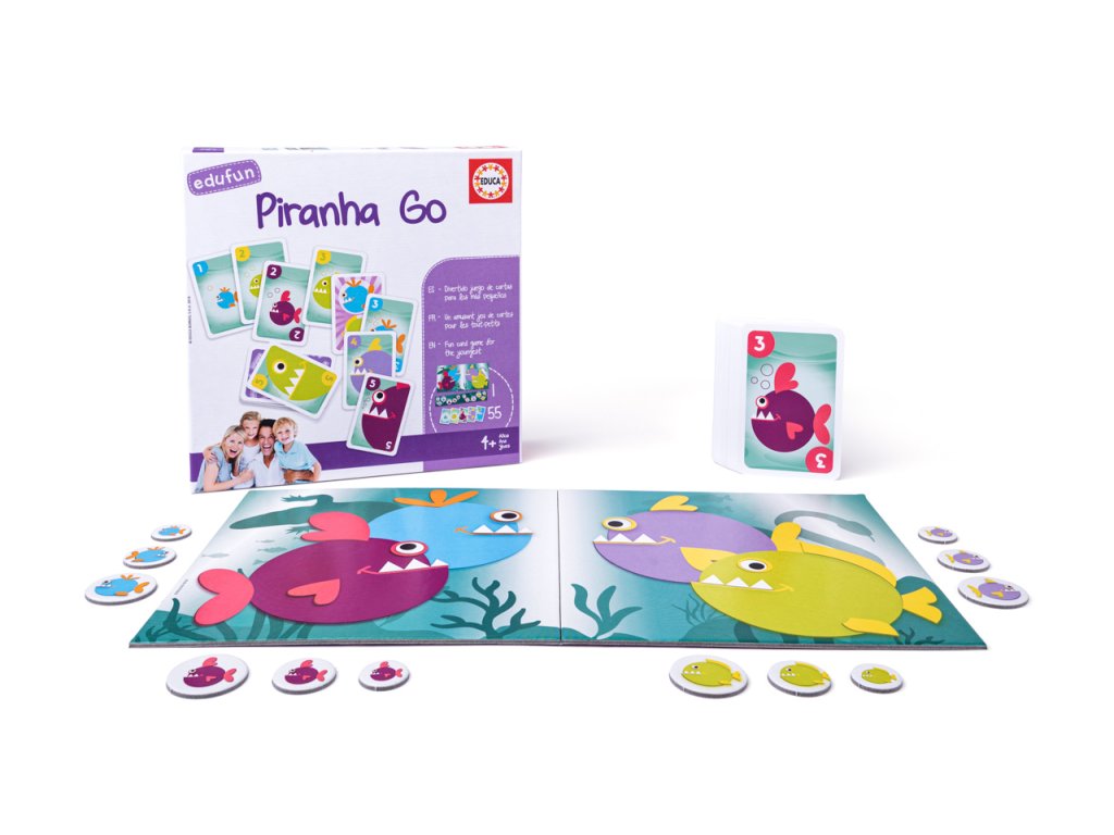 Zábavná desková hra s kartami – EDUCA – Piraně je určena pro děti od 4 let. Cílem hry je zbavit se karet s piraňami dřív než ostatní hráči. Dávej pozor! Řeka je plná nebezpečí…Hra obsahuje: 40 piraní ve 4 barvách a velikostech, 15 zvláštních kartiček (4 kartičky s dvojitou piraňou, 4 kartičky s překážkou na řece, 4 kartičky s hadem, 3 kartičky s žábou), hrací desku, pomůcku k počítání skóre, 12 žetonů s piraňami (3 od každé barvy), návod. Rozměr balení: 18,5 x 18,5 x 4,7 cm. Věk: 4+