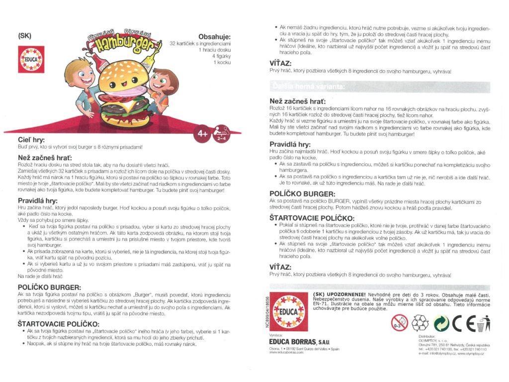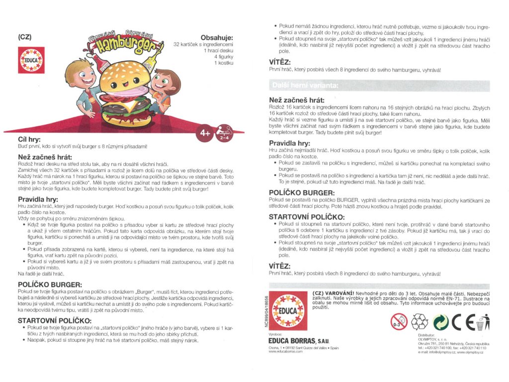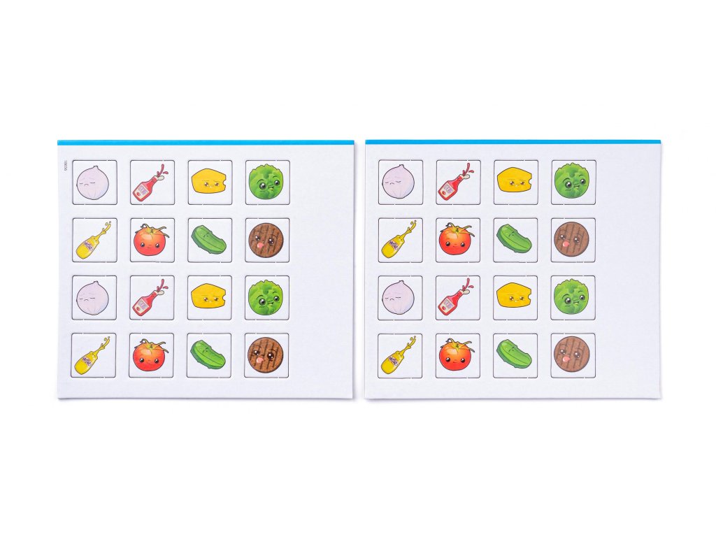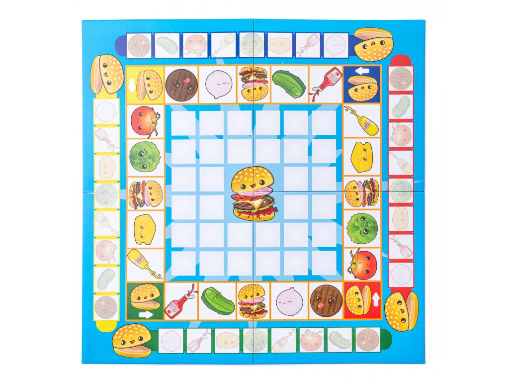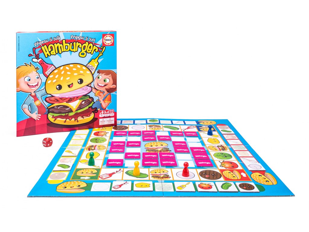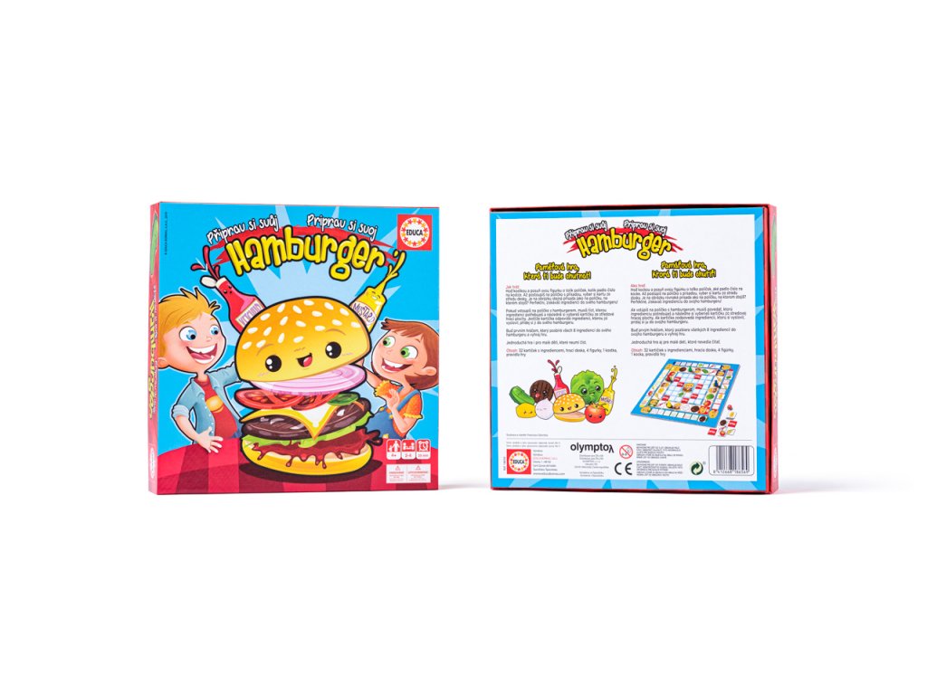 Paměťová hra, která ti bude chutnat! Hoď kostkou a posuň svou figurku o tolik políček, kolik padlo číslo na kostce. Až postoupíš na políčko s přísadou, vyber si kartu ze středu desky. Je na obrázku stejná přísada jako na políčku, na kterém stojíš? Perfektní, získáváš ingredienci do svého hamburgeru! Pokud vstoupíš na políčku s hamburgerem, musíš říct, kterou ingredienci potřebuješ a následně si vybereš kartičku ze středové hrací plochy. Jestliže kartička odpovídá ingredienci, kterou jsi vyslovil, přidej si ji do svého hamburgeru. Buď prvním hráčem, který posbírá všech 8 ingrediencí do svého hamburgeru a vyhraj hru. Jednoduchá hra i pro malé děti, které neumí číst. Hra je vhodná pro 2-4 hráče. Délka hry cca 25 minut. Hra obsahuje: 32 kartiček s ingrediencemi, hrací desku, 4 figurky, 1 kostku, pravidla hry. Rozměr balení: 25 x 5,5 x 25 cm. Věk: 4+