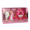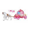 Bílý kůň s dlouhou hřívou zapřáhnutý do růžovéhop pohádkového kočáru. Každá panenka si bude přát vyrazit v něm na zámecký bál! Kůň má krásnou bílou hřívu, kterou můžeš česast přiloženými hřebeny. Kočár funguje na 3x1,5V baterie typu AG13, po zapnutí vydává reálné zvuky, hraje hudba a bliká. Baterie jsou součástí výrobku.