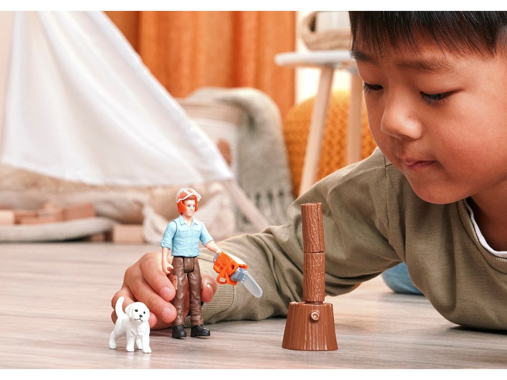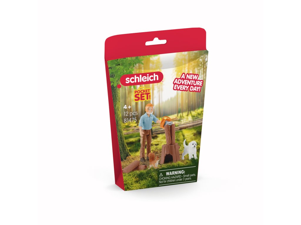 V lese je dnes rušno! Lesník zpracovává motorovou pilou silný kmen stromu a odřezává polena. Při práci odletují třísky, proto na sobě má ochrannou přilbu. Do lesa ho vždy doprovází malý bílý pejsek, který rád objevuje nové věci – třeba drzou veverku mezi stromy. Obsah: 1x figurka lesníka, 1x štěně, 1x veverka, 1x přilba, 1x motorová pila, 1x špalek, 4x nasekané dřevo. Hrací sada mini figurek funguje samostatně, ale také bez problémů se všemi ostatními výrobky Schleich®. Hrací sada z kolekce POCKET SET je vhodná pro děti od 4 let. Figurky Schleich® podněcují fantazii a zaručují hodnotný herní zážitek plný dobrodružství. Rozměry balení: 19,8 x 13,8 x 5,8 cm. Nevhodné pro děti do 3 let. Věk: 4+