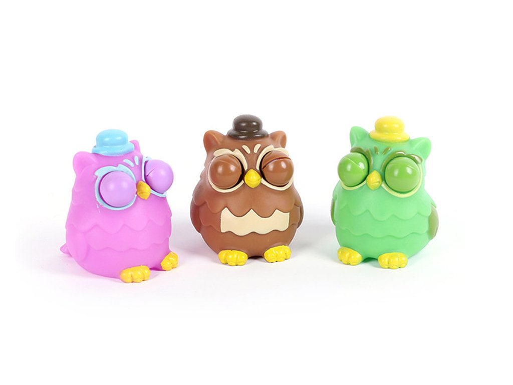 Mačkací sova. Velikost 7 cm. 12 ks display box. 3 varianty - fialová, hnědá, zelená.