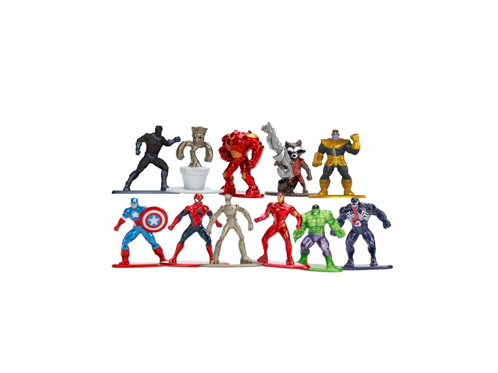 Kovové figurky o velikosti 4 cm, 11 druhů: Spiderman, Groot, Rocket Racoon, Ultimate Venom, Black Panther, Capt. America, Iron Man, Thanos, Hulk Buster, Hulk, Baby Groot. Nelze vybrat druh, dodáváme dle skladové dostupnosti.