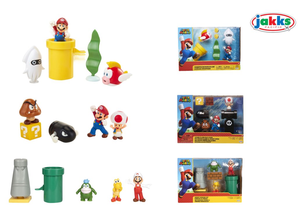 Super Mario Set. Velikost Maria 6 cm. 3 figurky s 2 doplňky. 3 varianty - Underwater, Acorn Plains, Desert.