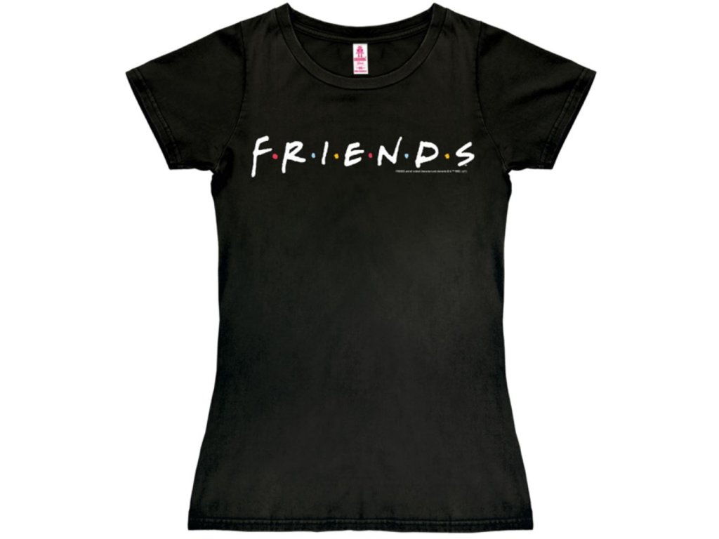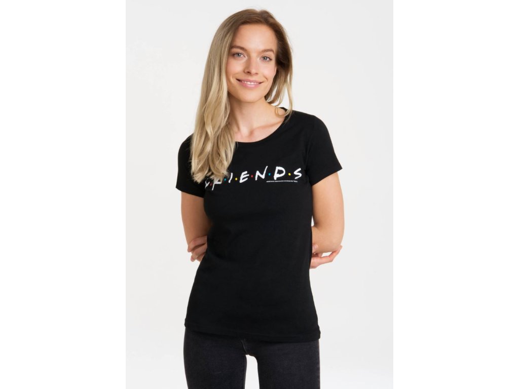Černé dámské tričko s krátkým rukávem a logem Friends na přední straně.