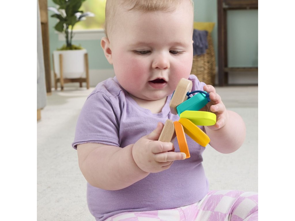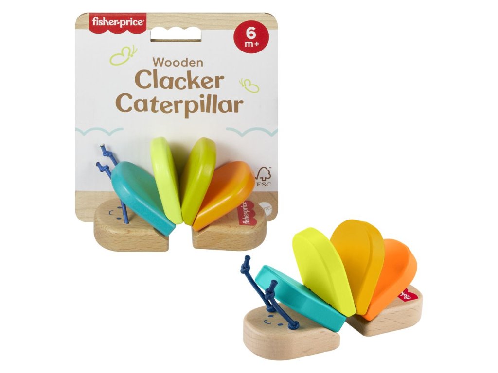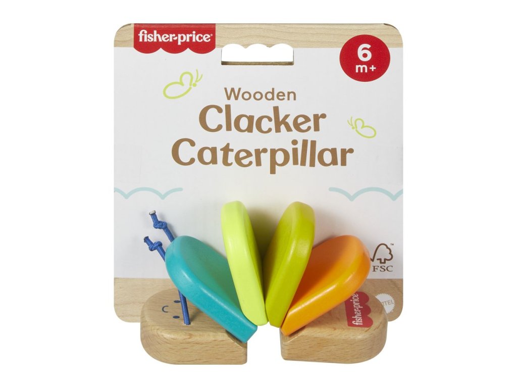 S touto dřevěnou hračkou od Fisher-Price® si děťátko může zahrát zajímavou smyslovou hru. Barevné chrastítko s motivem housenky, jehož velikost je tak akorát, aby ho mohly uchopit malé ručičky, vydává při třesení příjemné klapající zvuky. Hračka je vyrobená ze dřeva z dobře obhospodařovaných zdrojů s certifikátem Forest Stewardship Council (FSC C004225) a pomáhá posilovat jemnou motoriku dítěte.