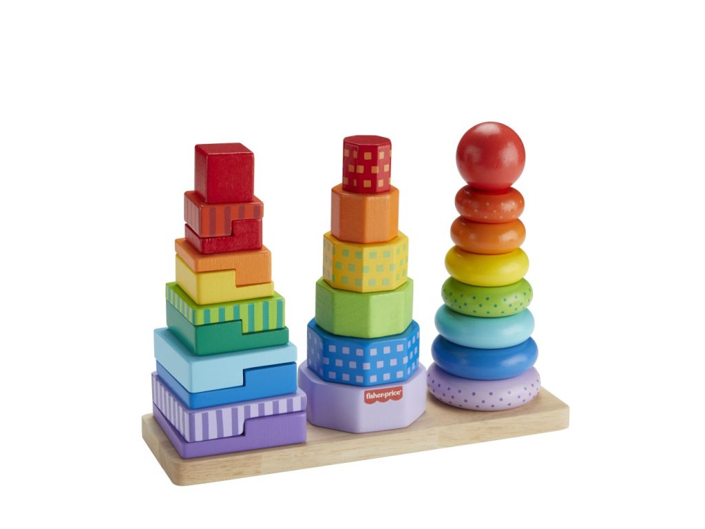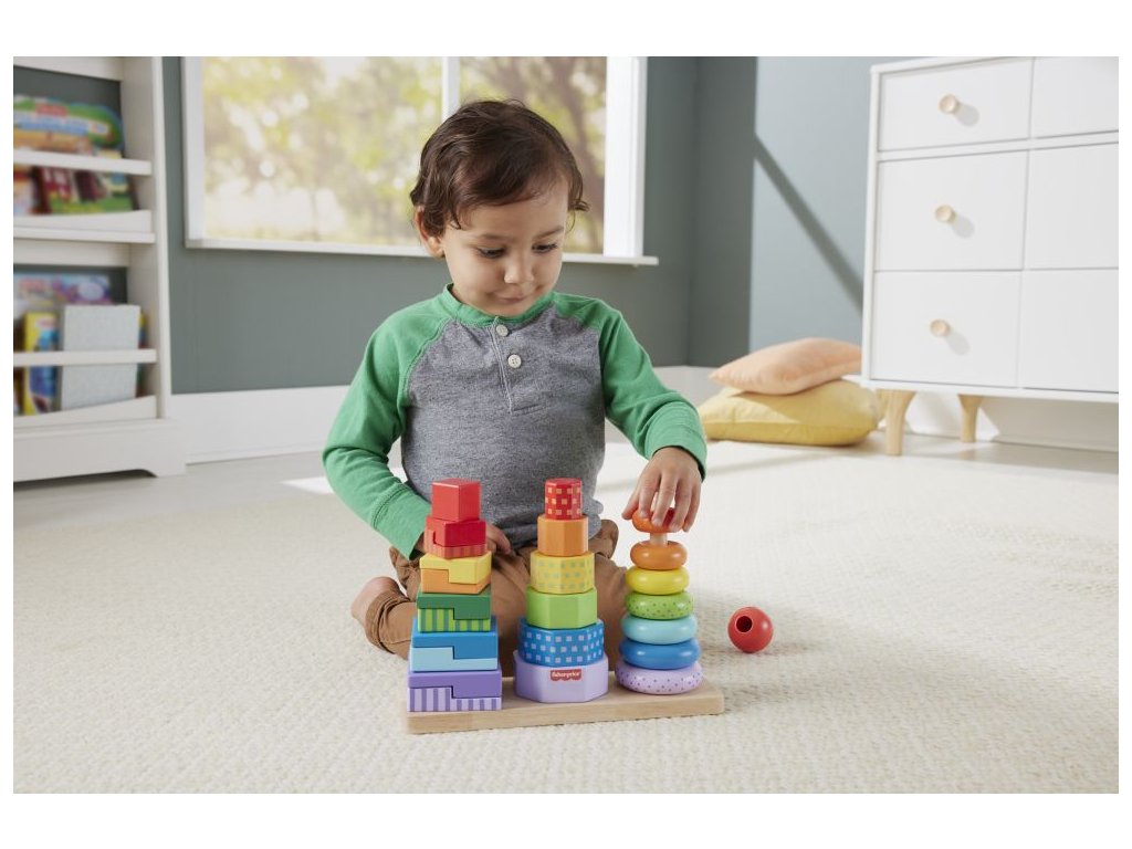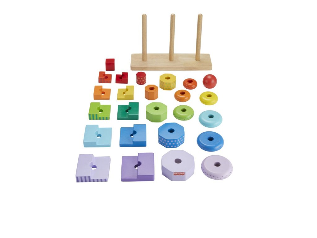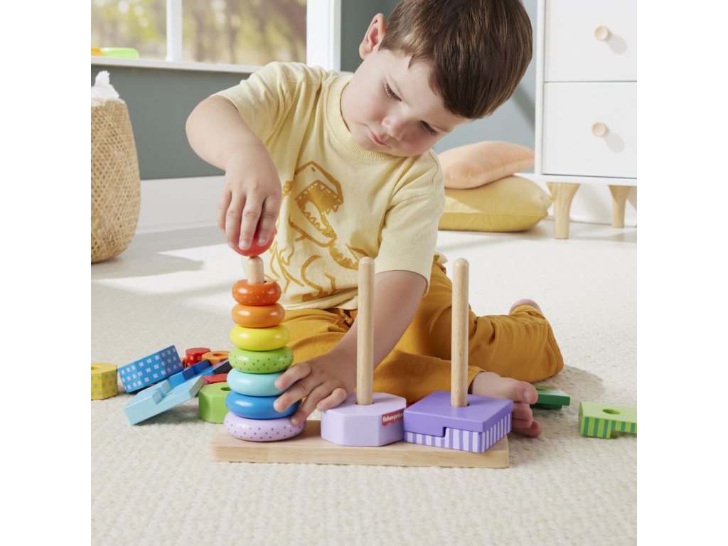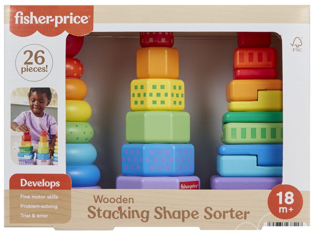 S dřevěným třídičem tvarů pro batolata od Fisher-Price® si užijete trojnásobnou zábavu. Tento set obsahuje snadno uchopitelné dřevěné kroužky, osmiúhelníky a dvoudílné geometrické obdélníky, které lze třídit a skládat na základnu. Tato skládací hračka pro děti předškolního věku je vyrobena ze dřeva z dobře obhospodařovaných lesů s certifikátem FSC®. (FSC C004225, 2021)