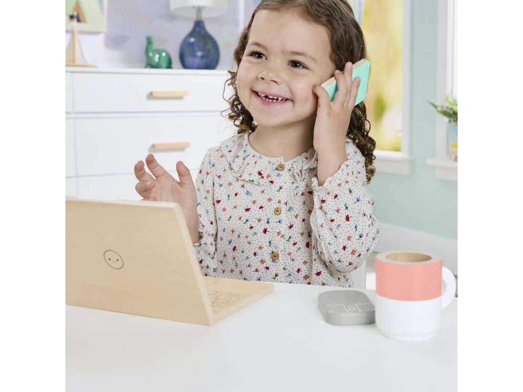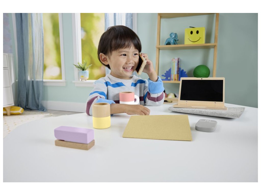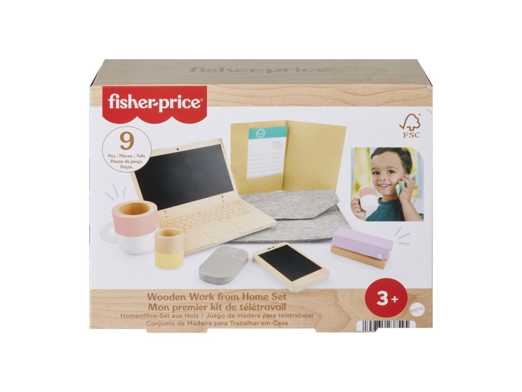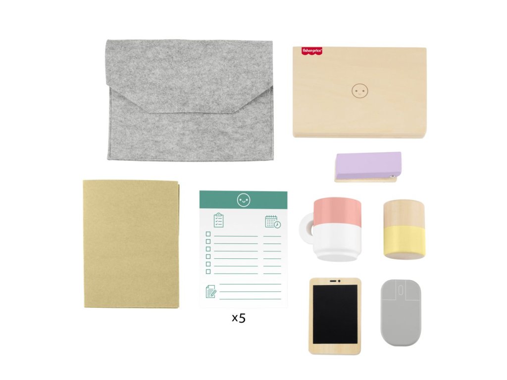 S dřevěným herním setem pro práci z domu od Fisher-Price® si děti v předškolním věku můžou zahrát na povolání maminky nebo tatínka. Set obsahuje 9 dílů: přenosný počítač a telefon s křídovými obrazovkami, počítačovou myš, hrnek na kávu, sešívačku, kelímek s perem, složku na dokumenty a sadu dokumentů. Dílky jsou vyrobené ze dřeva ze zdrojů s certifikací Forest Stewardship Council (FSC C130462).