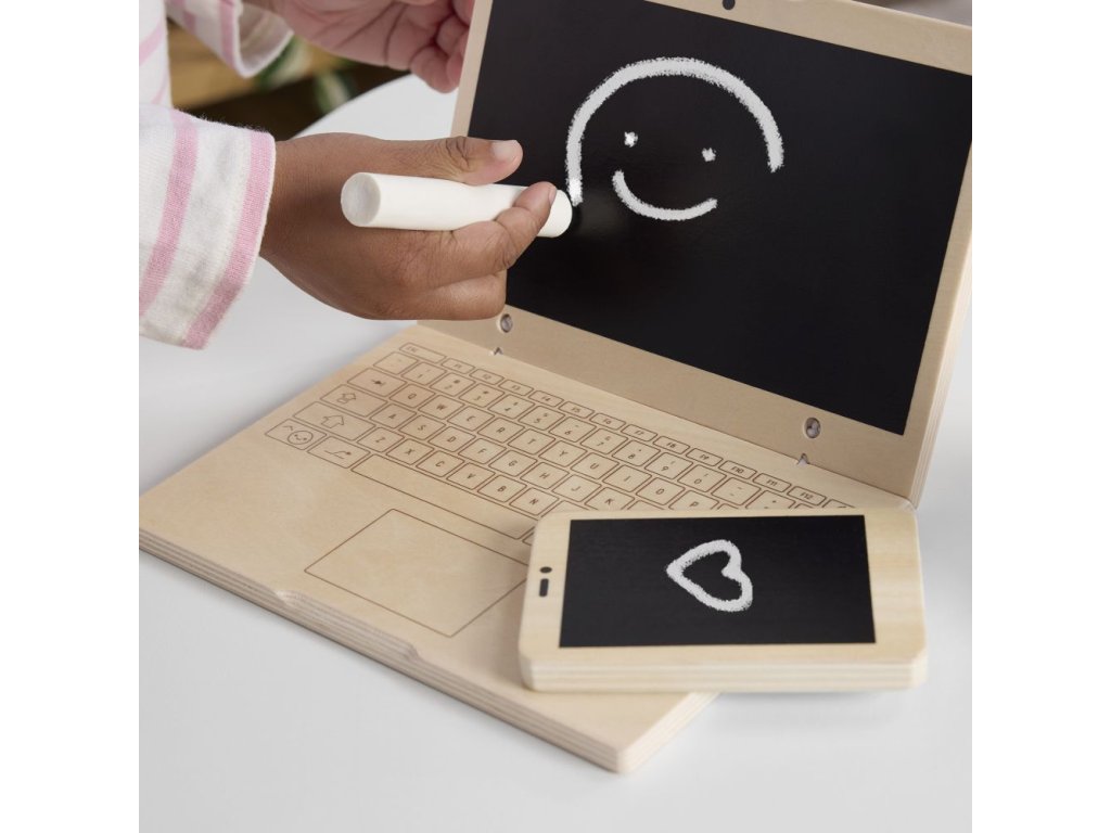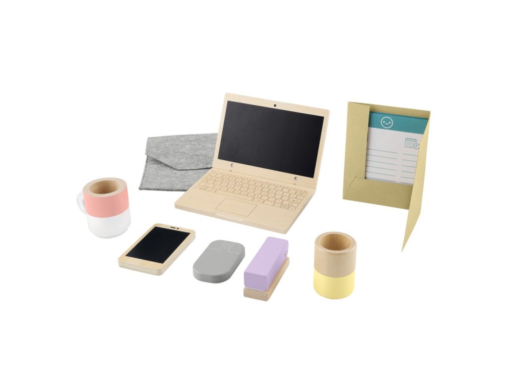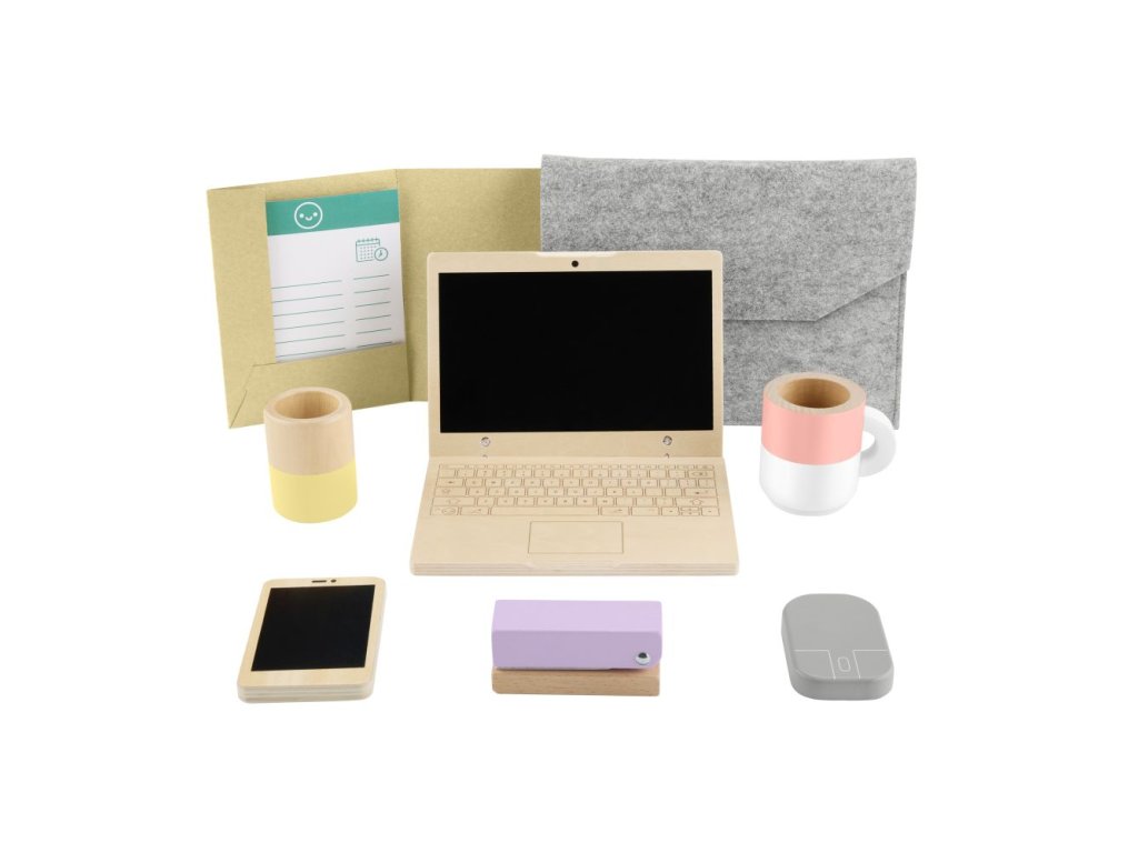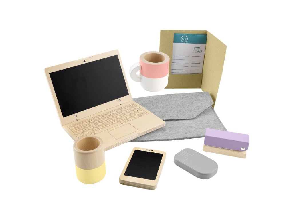 S dřevěným herním setem pro práci z domu od Fisher-Price® si děti v předškolním věku můžou zahrát na povolání maminky nebo tatínka. Set obsahuje 9 dílů: přenosný počítač a telefon s křídovými obrazovkami, počítačovou myš, hrnek na kávu, sešívačku, kelímek s perem, složku na dokumenty a sadu dokumentů. Dílky jsou vyrobené ze dřeva ze zdrojů s certifikací Forest Stewardship Council (FSC C130462).