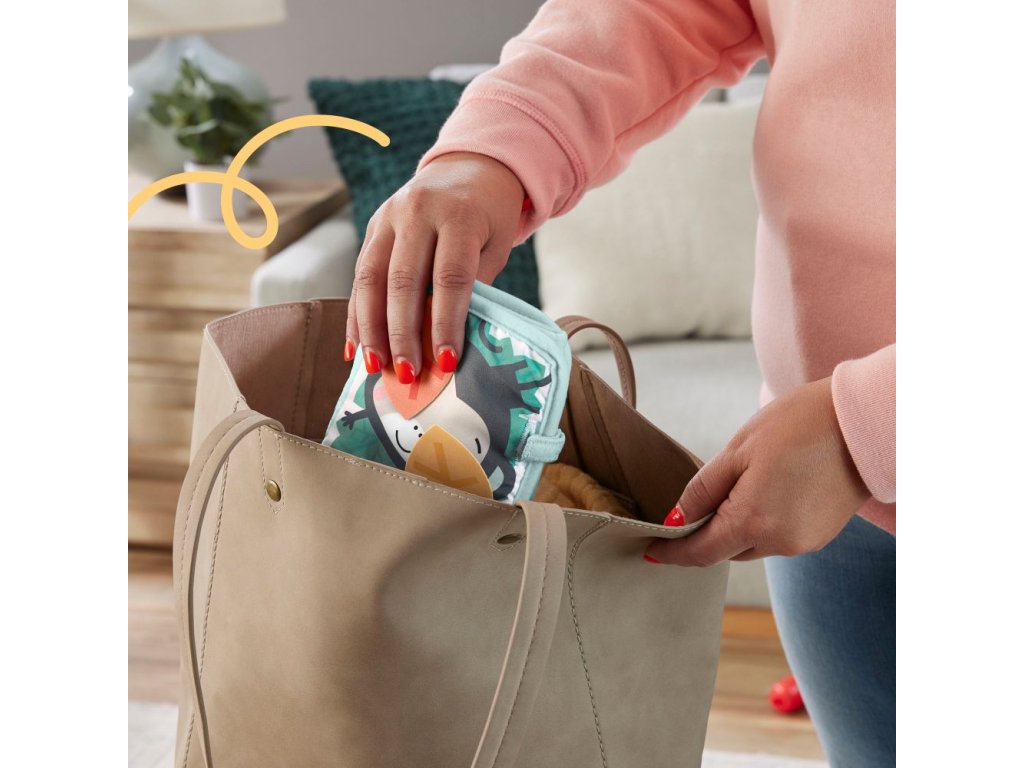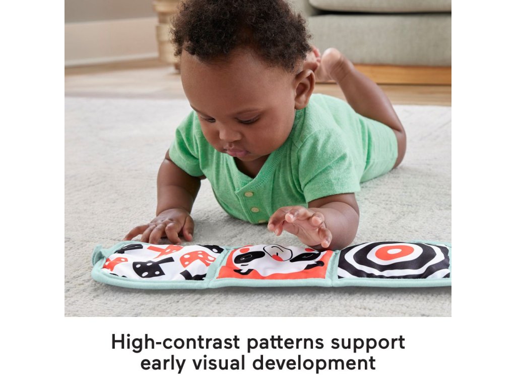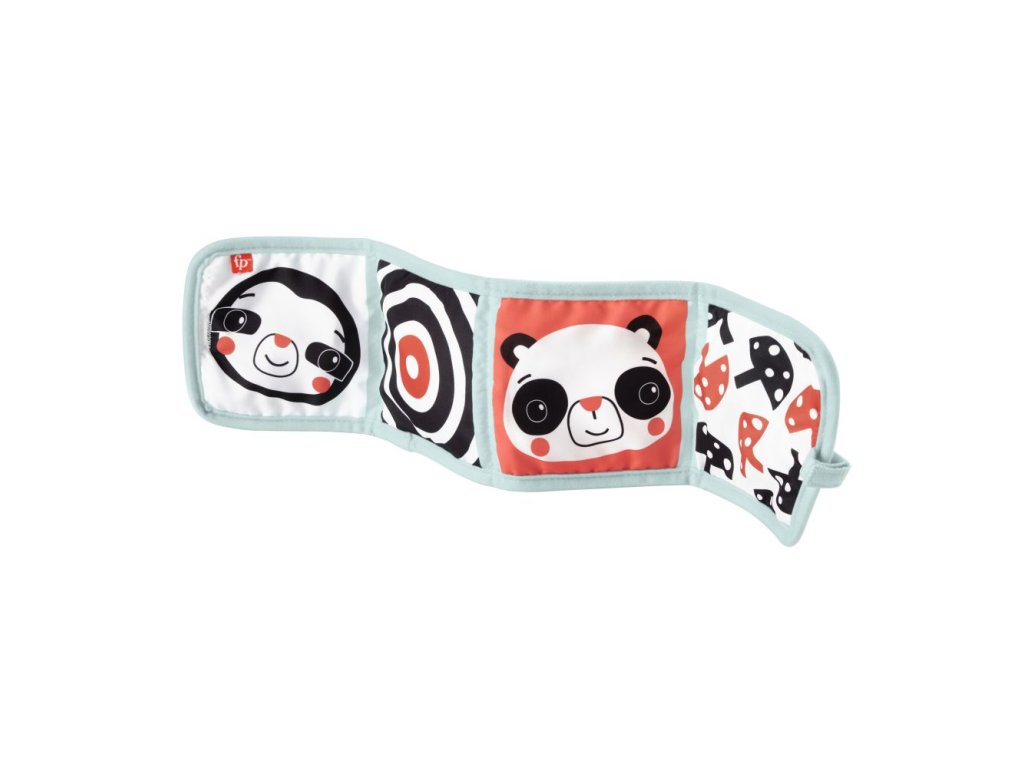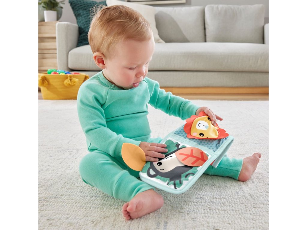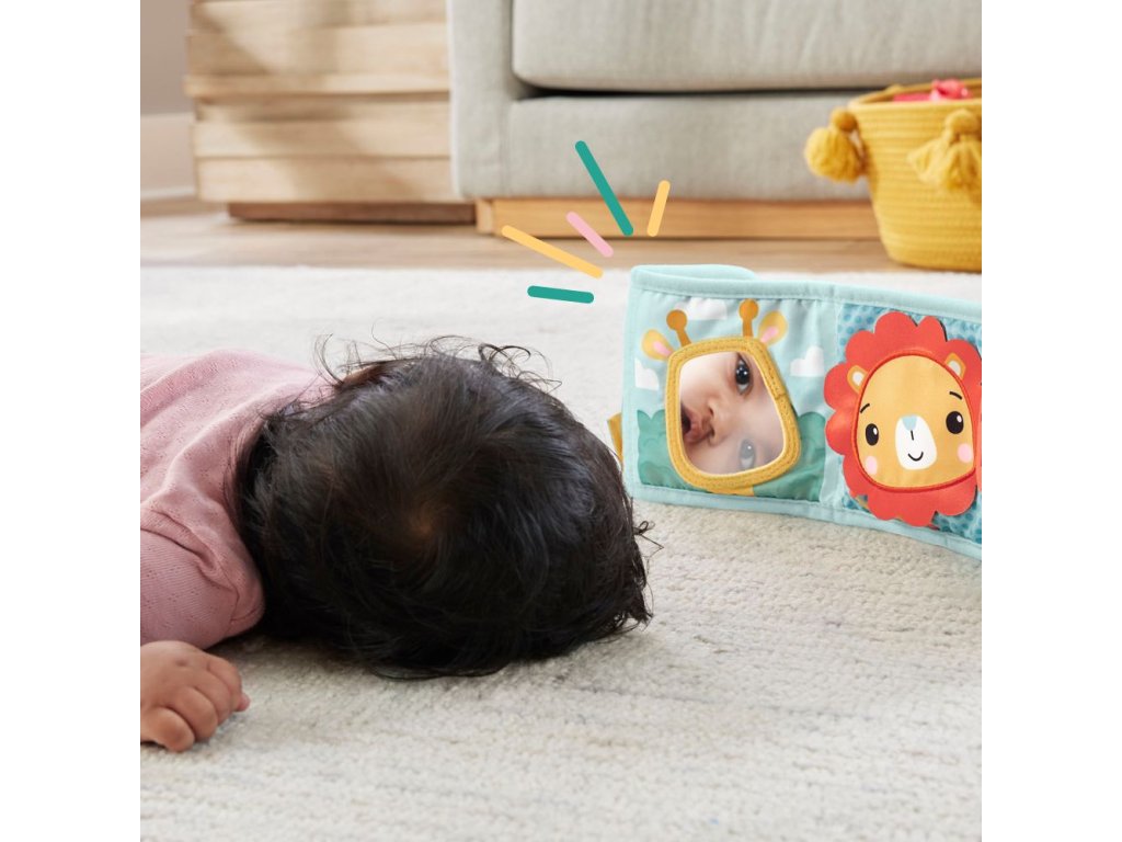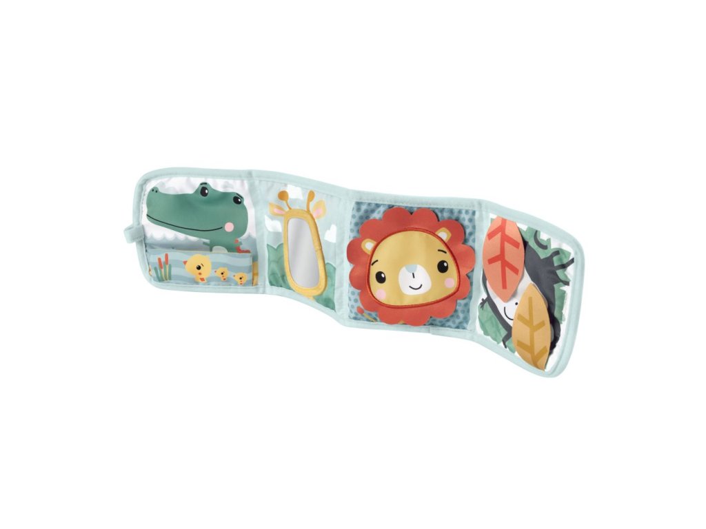 S Měkkým leporelem se zvířátky z džungle od Fisher-Price® se děťátko může dotýkat různých textur, chrastit, obracet, zkoumat svůj obličej v zrcátku a objevovat. 4 oboustranné panely této měkké knížky s barevnými a vysoce kontrastními vzory pomáhají při nejranějším vývoji zraku dítěte. Leporelo má poutka na suchý zip pro připevnění např. k hrazdičkám.