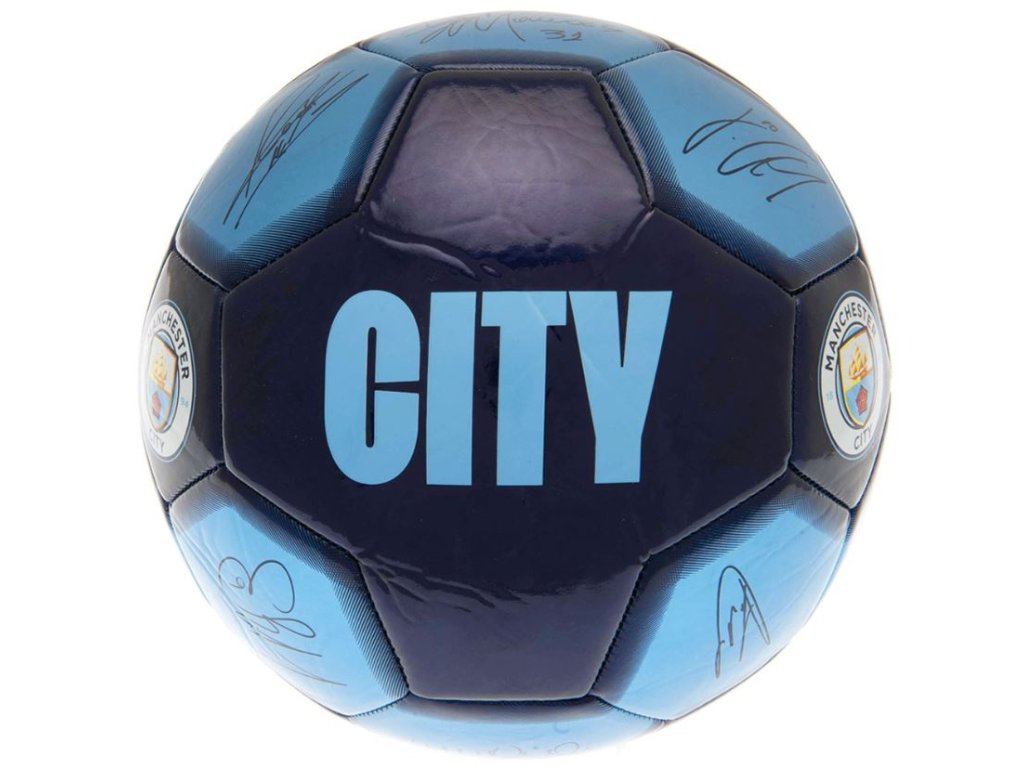Hrací fotbalový míč v modro-bílé barvě s hlavním znakem a podpisy hráčů fotbalového klubu FC Manchester City. Míč je vhodný pro každého menšího i většího fotbalového nadšence.