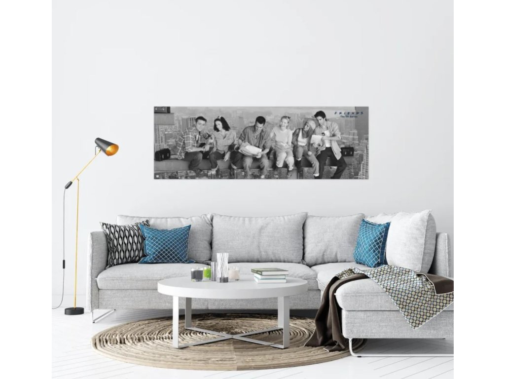 Plakát s černo-bílou fotografií herců seriálu Friends. Plakát je inspirovaný známou fotografií dělníků obědvajícího na nosníku při stavbě Rockefellerova centra v New Yorku. Vhodný jak na klasické nalepení na zeď, dveře či skříň, tak na zarámování a vytvoření si tak luxusního obrazu.