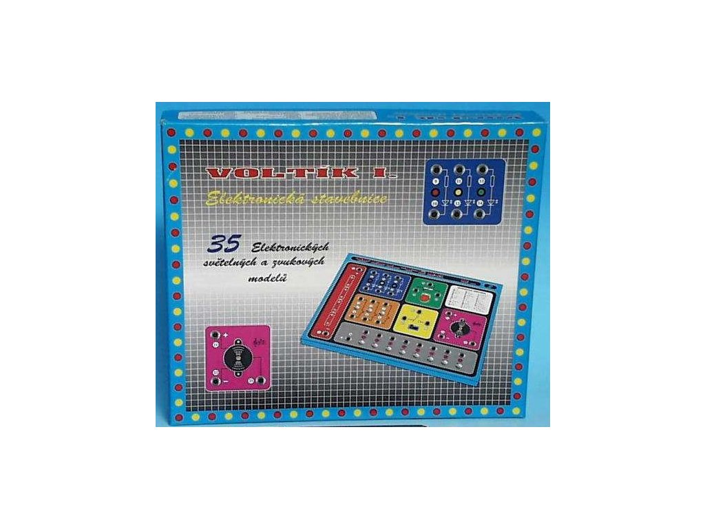 Stavebnice VOLTÍK I. umožňuje sestavit podle jednoduchých návodů nejméně 35 elektronických modelů bez pájení s barevnými světélky a tónovým bzučákem.