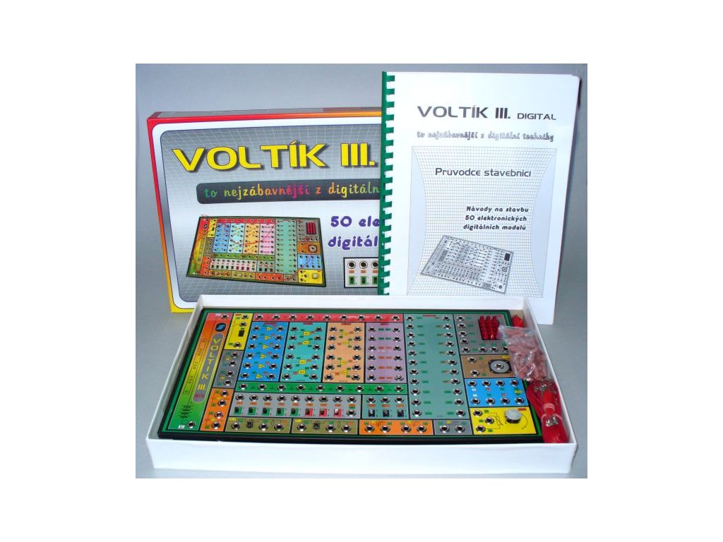 Elektronická hra Voltík III. Balení obsahuje: logické integrované obvody, čítač, pamět SRAM, díly potřebnébné k sestavení 50 digitálních modelů bez pájení.