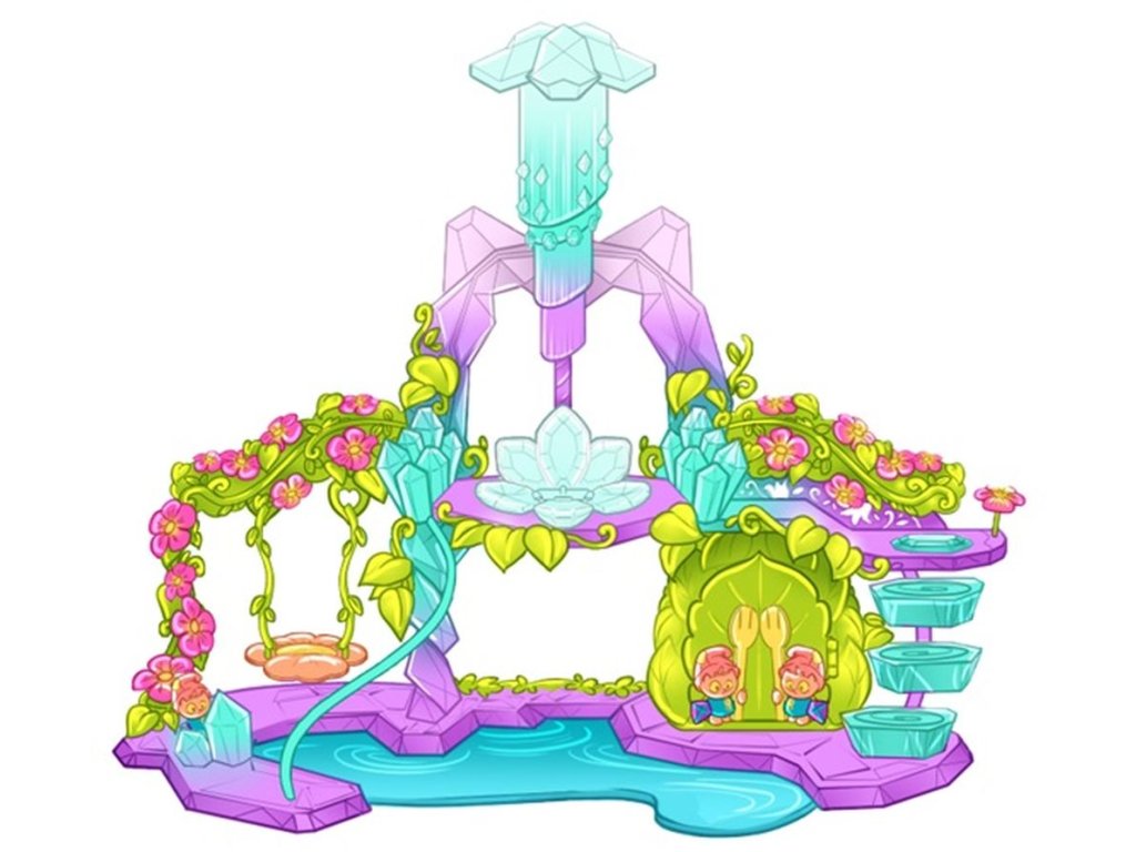 Velký hrací set Křišťálová zahrada obsahuje několik akčních zon, kde si děti mohou s figurkami hrát na scény z nového filmu Gabby's Dollhouse.