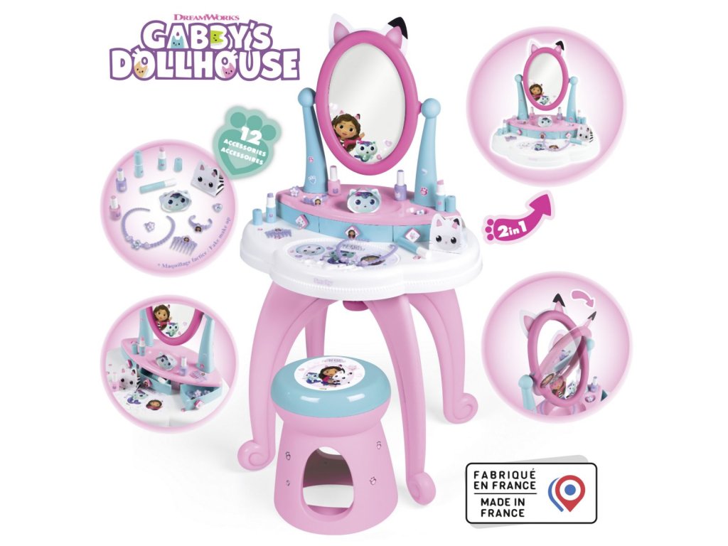 Toaletní stolek v designu Gabby´s Dollhouse se třpytivým efektem pro malé parádnice. Více než 10 ks příslušenství (např. čelenka, hřeben, prstýnky, lak na nehty, rtěnka atd.). Součástí nastavitelné zrcátko a židlička, nosnost židličky 50 kg. Toaletní stolek lze oddělit od nohou a postavit na stůl. Rozměry: 49 x 94 x 36 cm. Hmotnost 2,36 kg.