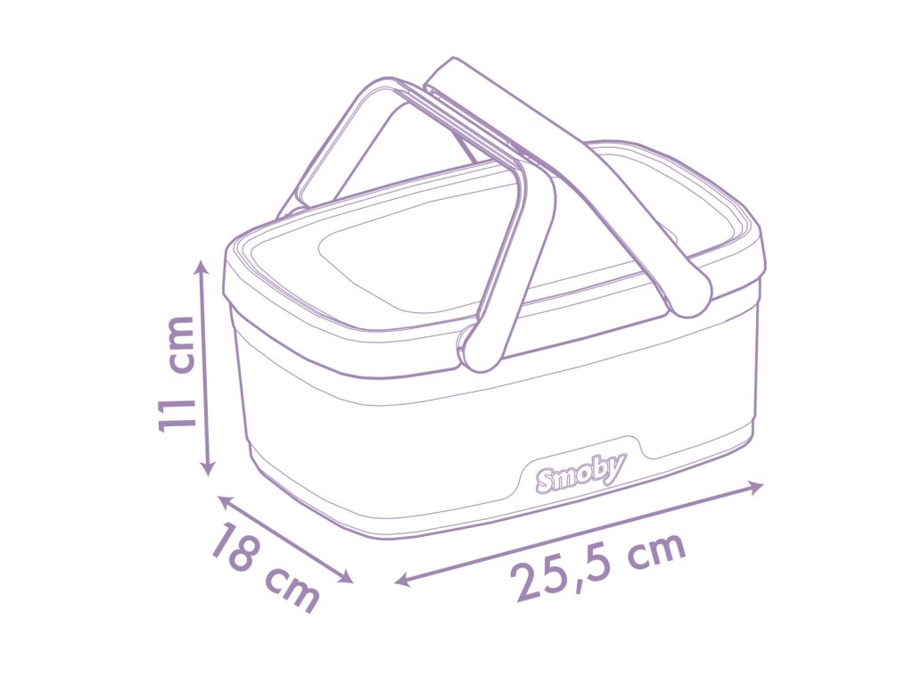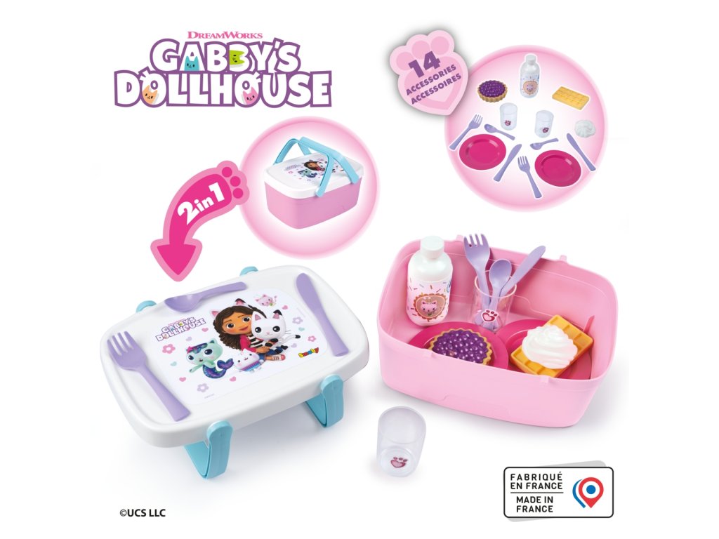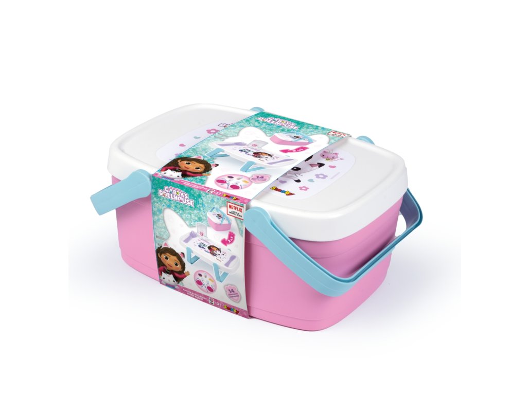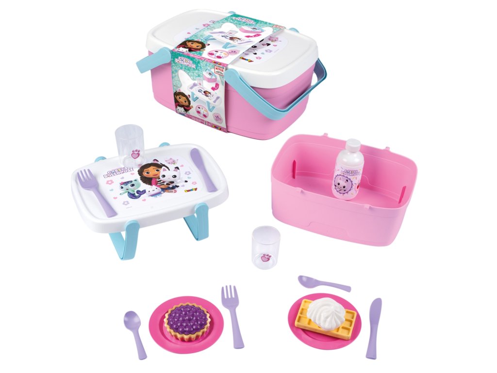 Piknikový koš 2 v 1 s motivem Gabby´s Dollhouse lze snadno přeměnit na stoleček - sklopením rukojetí u víka. Součástí je 14 ks příslušenství: 2 talířky, 2 lžičky, 2 nože, 2 vidličky, 2 skleničky, 1vafle, šlehačka, borůvkový koláč, láhev limonády. Rozměry (DxŠxV): 25,5 x 18 x 11 cm.