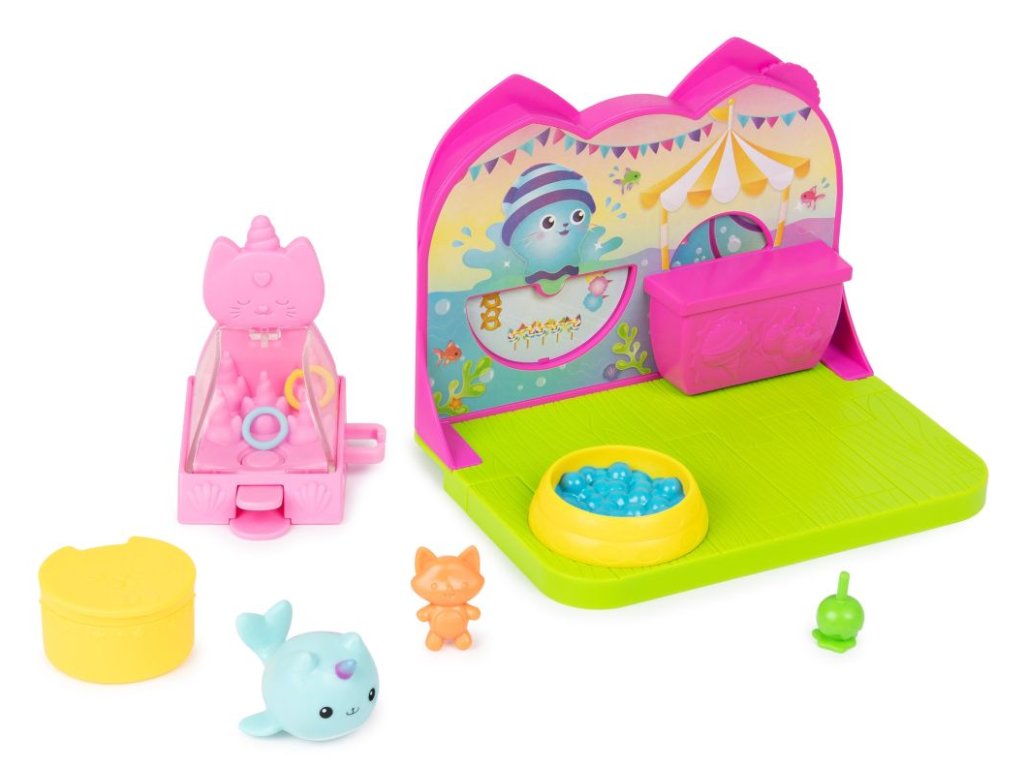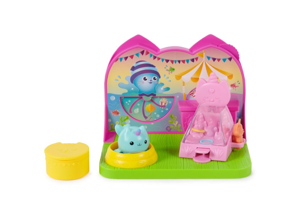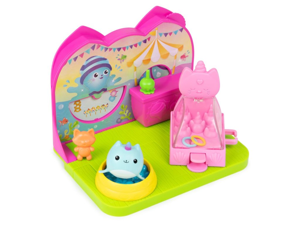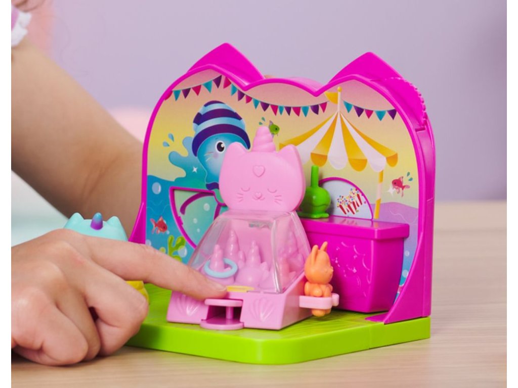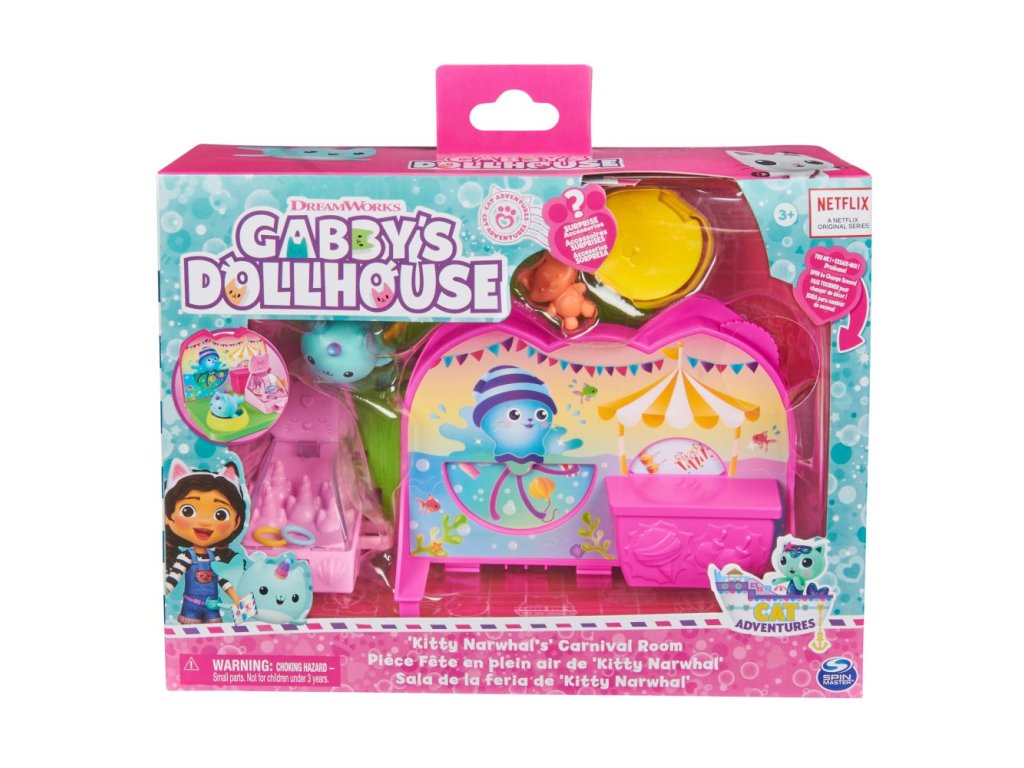 Připravte se na spoustu zábavy a zážitků s Kytočkou v soupravě Karnevalový pokoj! Tato hrací souprava obsahuje senzační karnevalový pokojíček a nábytek do kouzelného domku, který můžete použít jak na lodi Gábininých kočičích kamarádů, tak i v Gábinině perfektním domku (prodávají se zvlášť)! Obsahuje roztomiloučkou figurku Kytočky, která měří téměř 2 cm, bazén s míčky, hru na házení kočičích kroužků, dobroty a mnoho dalšího! Dejte Kytočku do bazénu s míčky, zkuste své štěstí v hodu kroužkem, vyhrajte cenu, otočte ovládacím kolečkem a vychutnejte si změnu prostředí! Potom si stejně jako Gábi na začátku každé epizody rozbalte svou speciální krabičku s překvapením a objevte další hračku – karamelové jablko. Jako poslední překvapení si naskenujte QR kód zevnitř krabičky s překvapením z Kouzelného domku a odemkněte si speciální odměnu v aplikaci Gábinin kouzelný domek (k dispozici pro iOS a Android). Pro ještě více způsobů, jak si hrát, hledejte loď Gábininých kočičích kamarádů, Gábinin perfektní kouzelný domek a tematické pokojíčky, abyste si ještě více vytvořili svět svého kouzelného domku (každý se prodává zvlášť)! Plyšáci, panenky, figurky a herní sady na motiv Gábinina kouzelného domku jsou perfektními hračkami pro dívky a chlapce, kteří rádi zapojují svou představivost k vytvoření svého vlastního světa Kouzelného domku, takže se připravte na nekončící dobrodružství s Kytočkou a jejím Karnevalovým pokojem z Gábinina kouzelného domku!