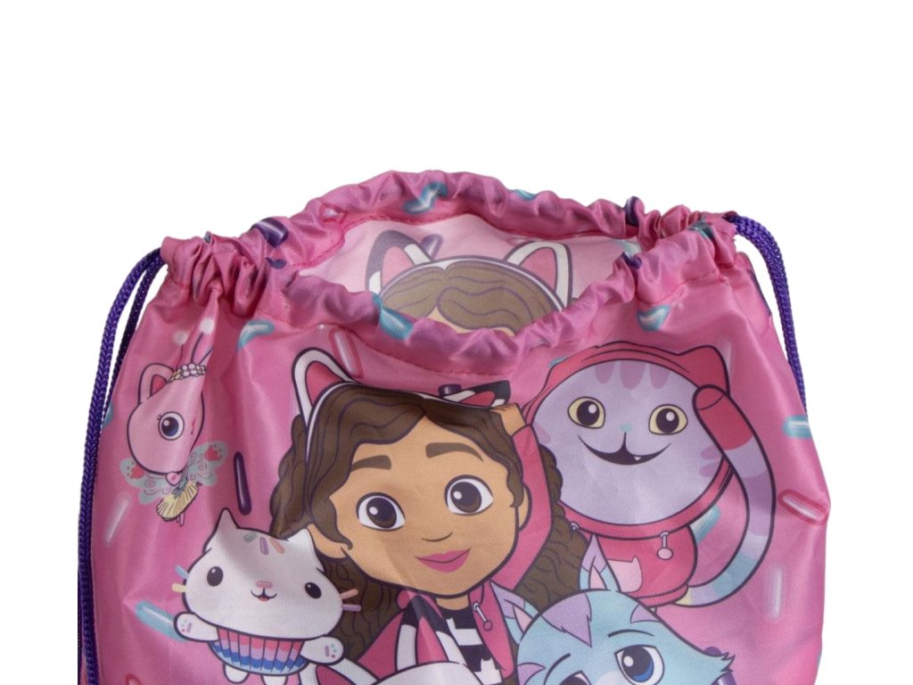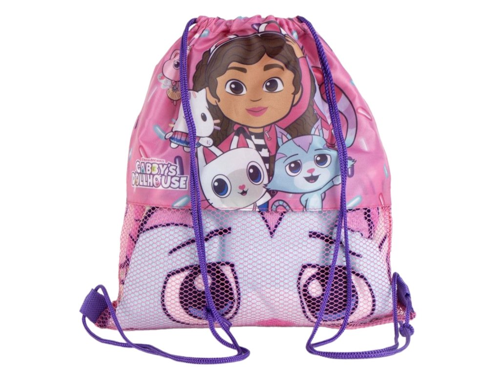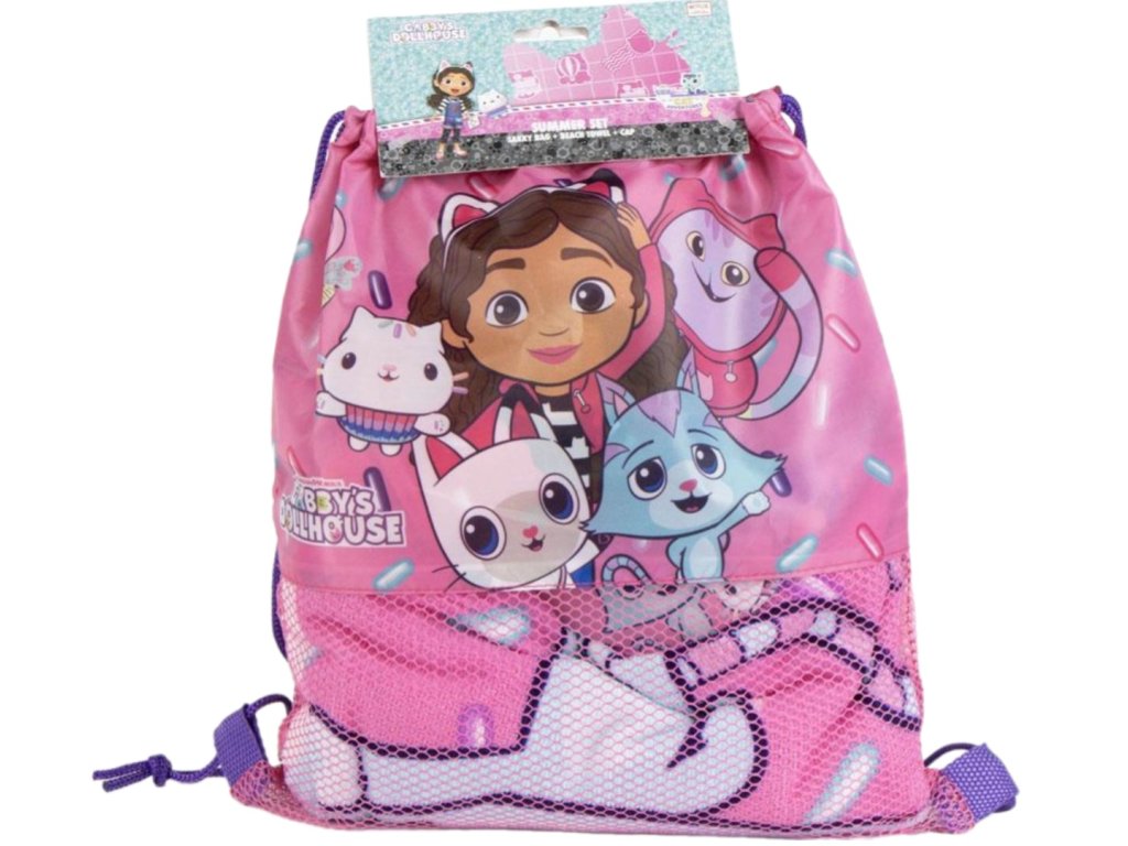 Oficiální produkt - set dětské osušky, kšiltovky a gym pytlíku z katalogu výrobků s grafikou, fotografiemi a licencí dětského animovaného seriálu Gabby's Dollhouse.