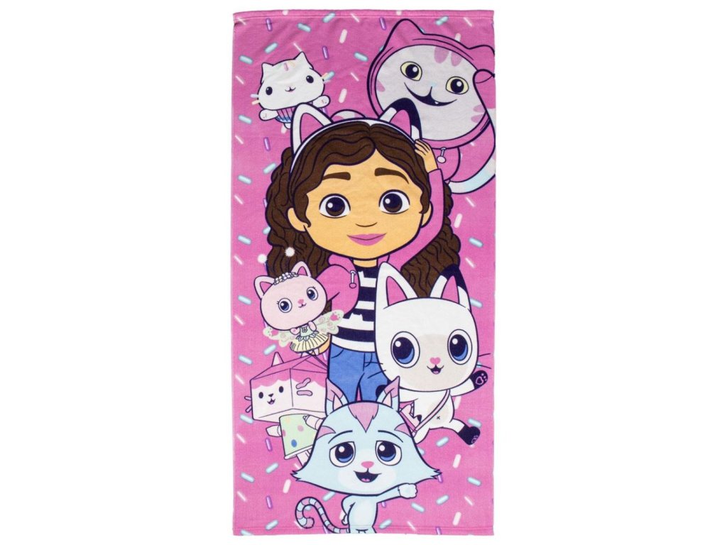 Atraktivní růžová osuška s grafikou Gáby a jejich přátel, kšiltovka s grafikou Gáby a její kočky a gym pytlík pro všehny menší i větší fanoušky animované pohádky Gábinin kouzelný domek pro panenky.