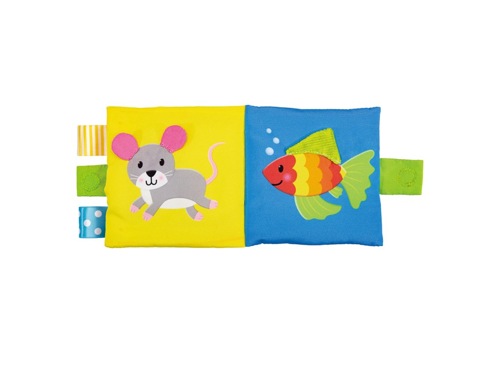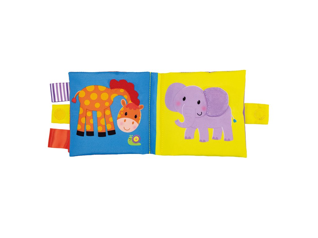 Knížka je vyrobena z příjemného měkkého materiálu. Hlavy zvířátek obsahují různé látkové materiály a mohou vydávat zvuky, proto je knížka ideální pro podpoření hmatových, zrakových i zvukových vjemů dítěte. Knížku je možné prát v pračce. Vhodné pro děti již od 0 měsíců.UPOZORNĚNÍ Obal není hračka, před použitím hračky ho odstraňte z dosahu dítěte, může způsobit zadušení.