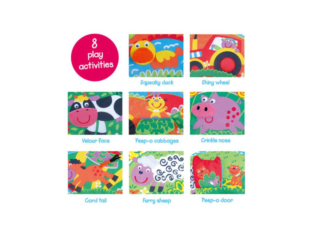 Jedinečná ohrádka s motivem farmy vhodná pro odpočinek nebo hru! Díky mnoha aktivním prvkům prožije Vaše dítě nejen fantastickou zábavu, ale také poznávání hmatových, zrakových i zvukových vjemů! Balení obsahuje nafukovací ohrádku, samostojící ramena a 4 zajímavé hračky na zavěšení do prostoru. Tato hračka v sobě ukrývá 8 aktivních prvků - vydávají zvuky či mají zajímavou texturu.