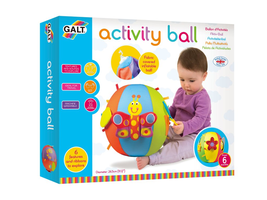 Na míči je připevněno 6 druhů aktivit pro děti a barevné pásy po stranách.