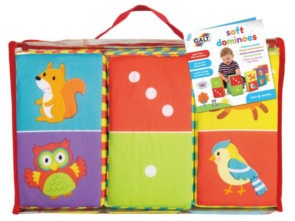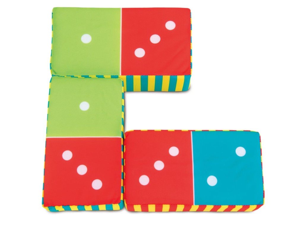 Šest velkých dominových kostek s molitanovou výplní, které se dají stavět a bořit. Starší děti můžou hrát domino nejdřív tak, že budou k sobě dávat dvojice lesních zvířátek a pak počítat puntíky na kostkách.
