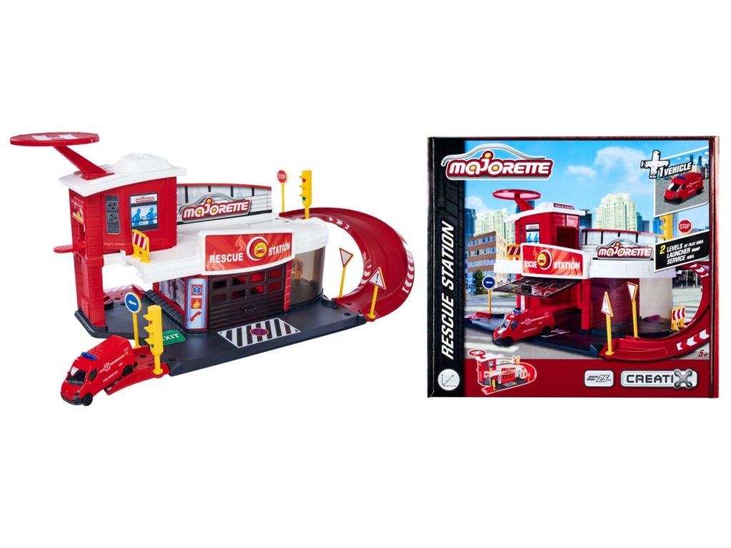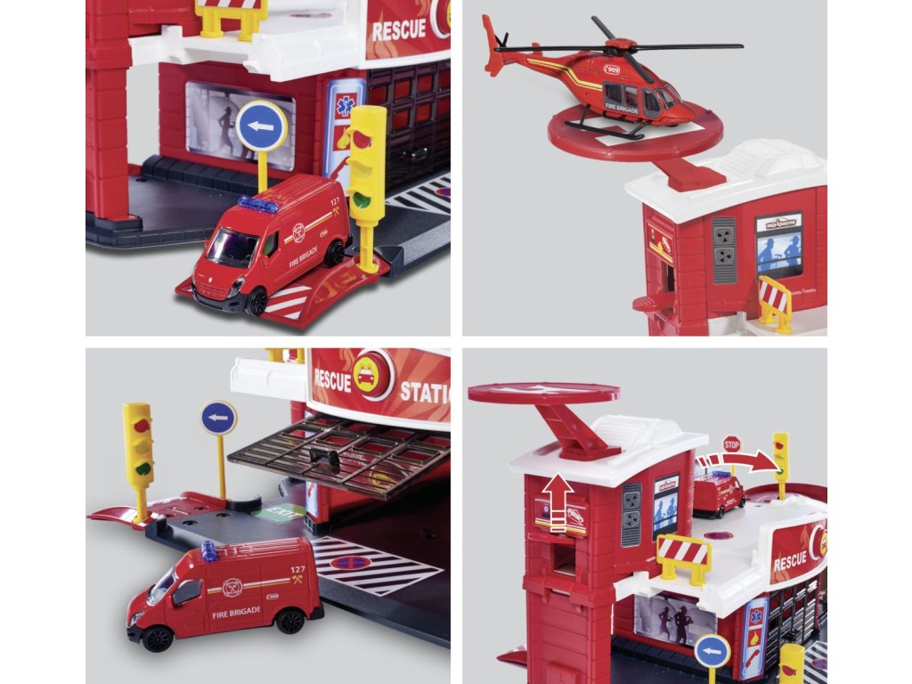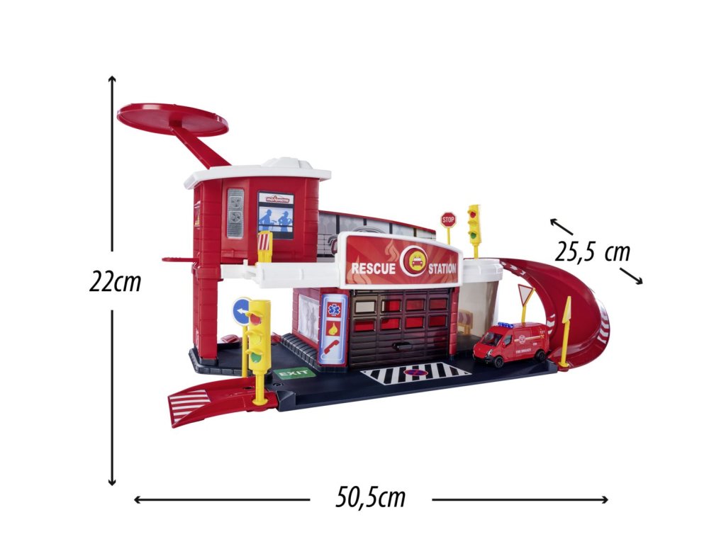 Hasičská stanice, 2 patra, heliport, 1 autíčko součástí. Rozměry: 55,5 x 25,5 x 22 cm.