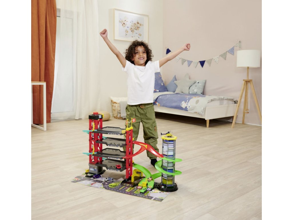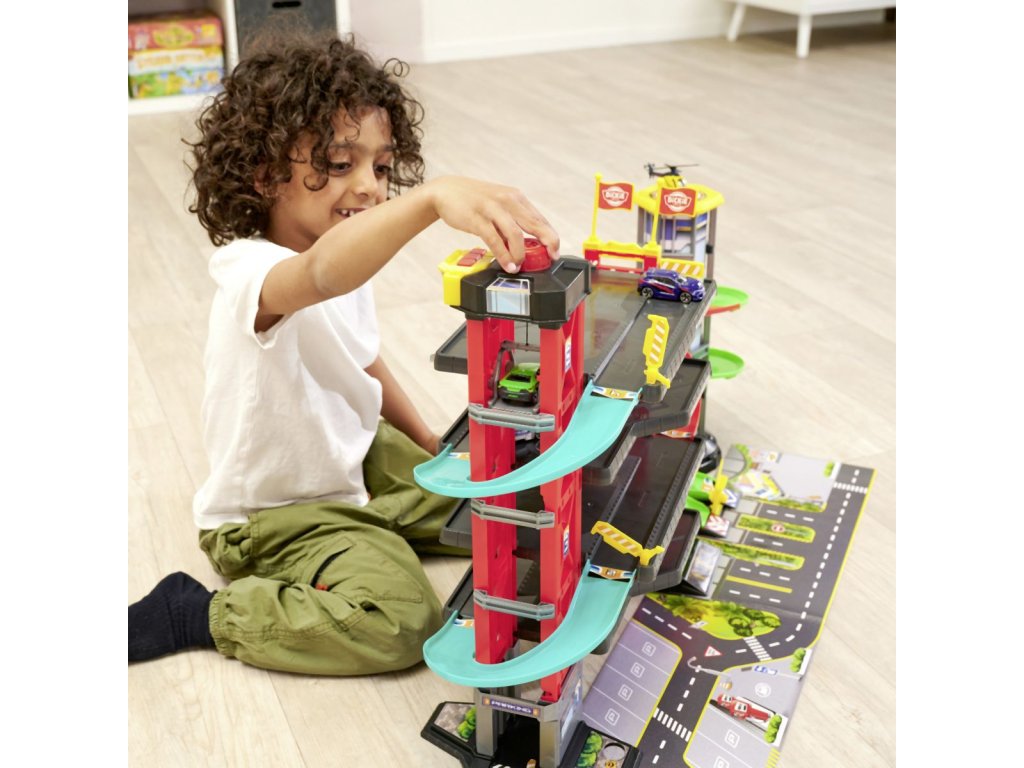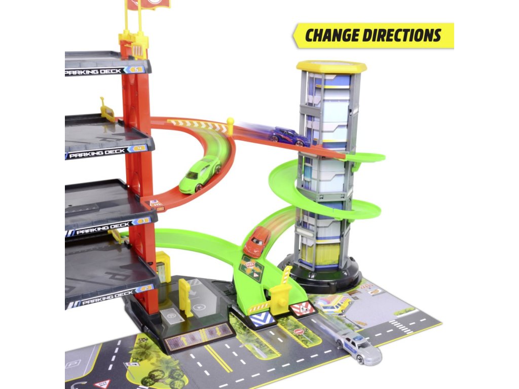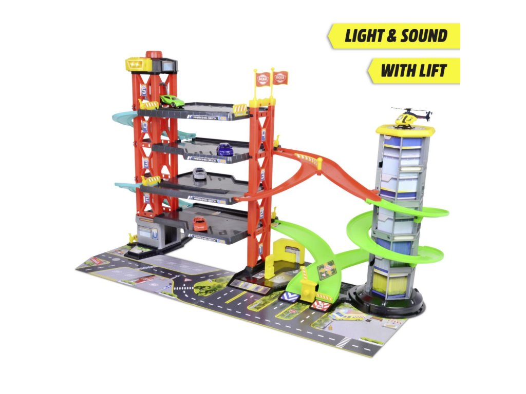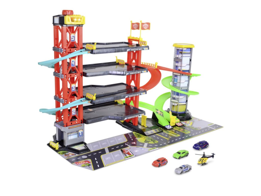 Parkovací garáž má 4 podlaží, dráhu, funkce zvuku i světel, manuální výtah. Součástí jsou 4 kovová autíčka, vrtulník a doplňky. Rozměry garáže: 81,5 x 22,5 x 52 cm.
