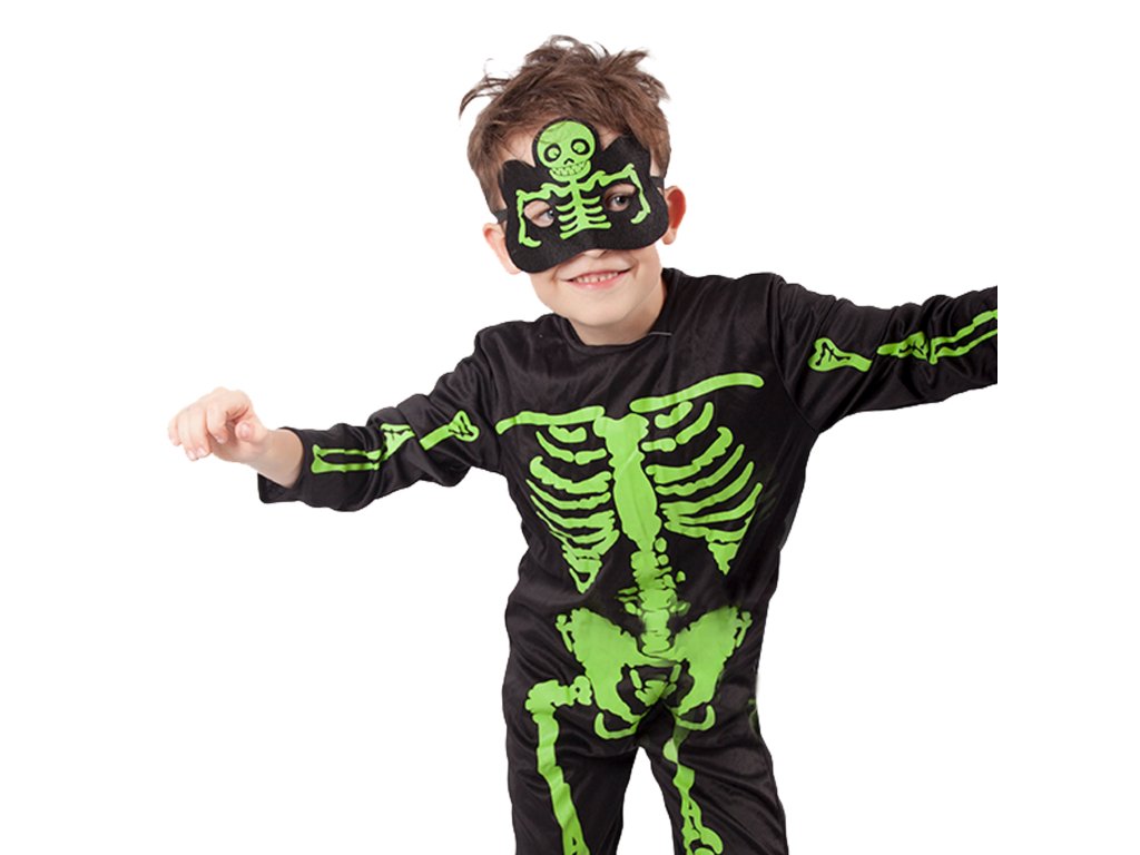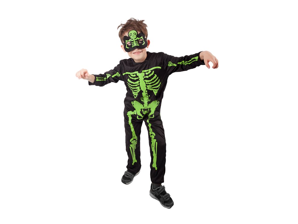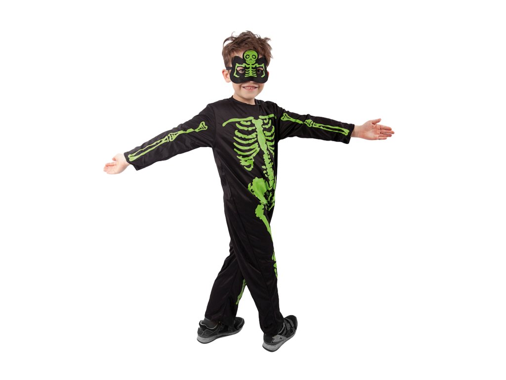Strašidelný karnevalový kostým s motivem kostlivce! Kostým ve velikosti M je určen pro chlapečky ve věkovém rozmezí 6-8 let. Balení obsahuje černou kombinézu a masku s motivem zeleného kostlivce.
