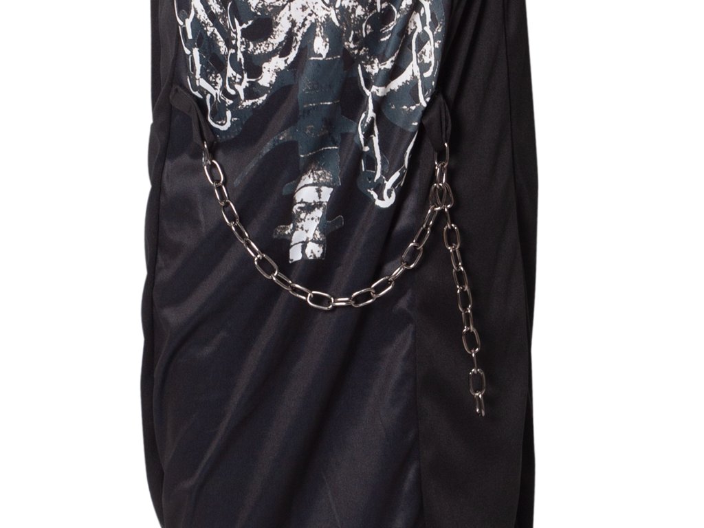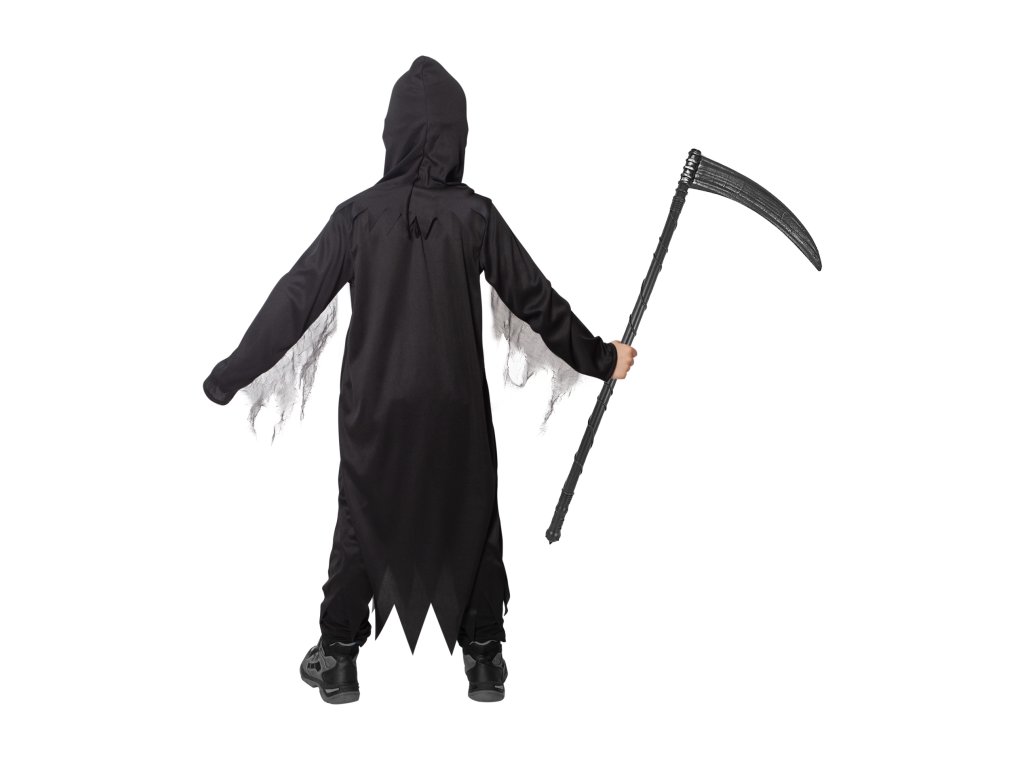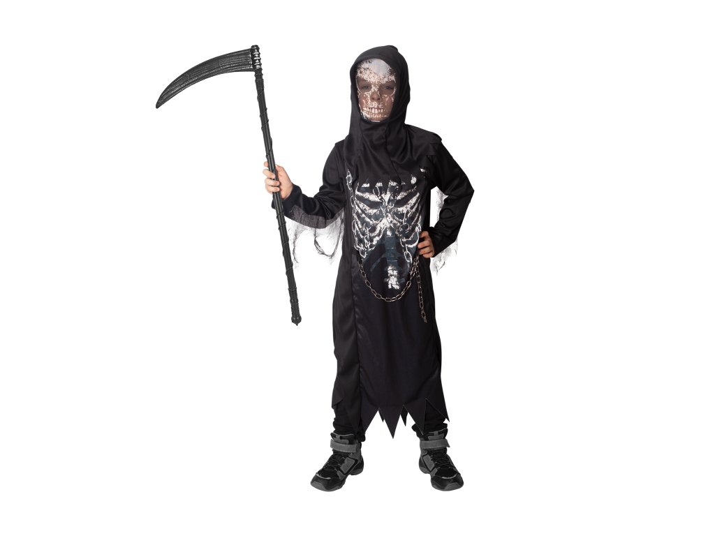 Strašidelný karnevalový kostým s motivem smrtky! Kostým ve velikosti S je určen pro děti ve věkovém rozmezí 4-6 let (105-116 cm). Balení obsahuje černý hábit s bílým potiskem kostry a kapuci. Součástí kostýmu je řetěz.