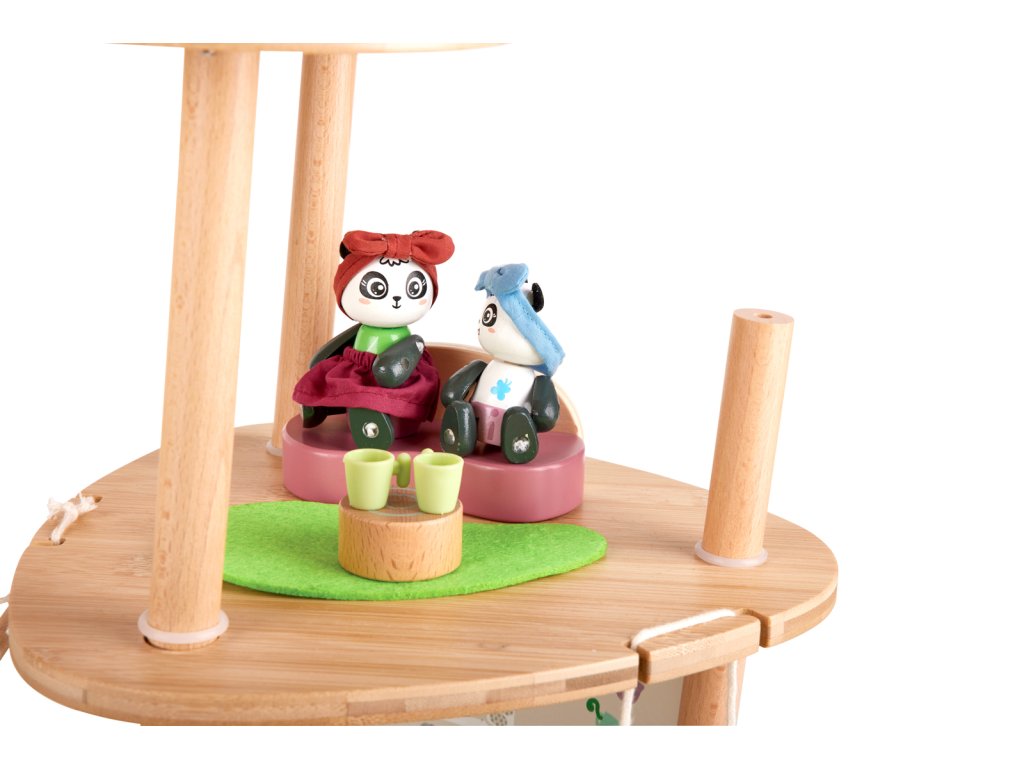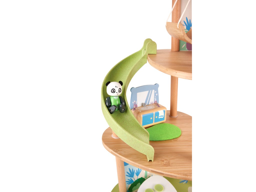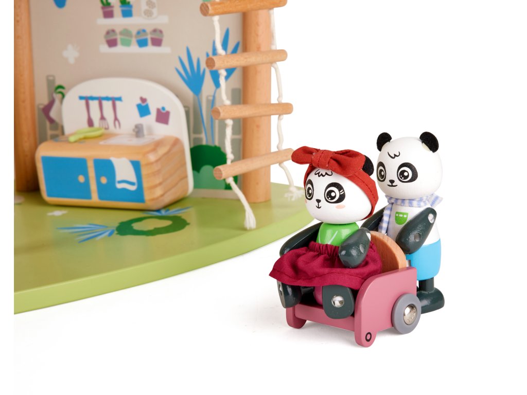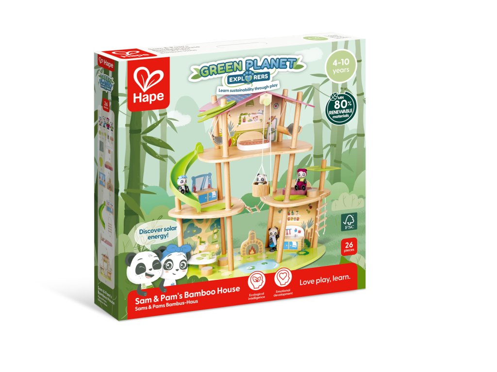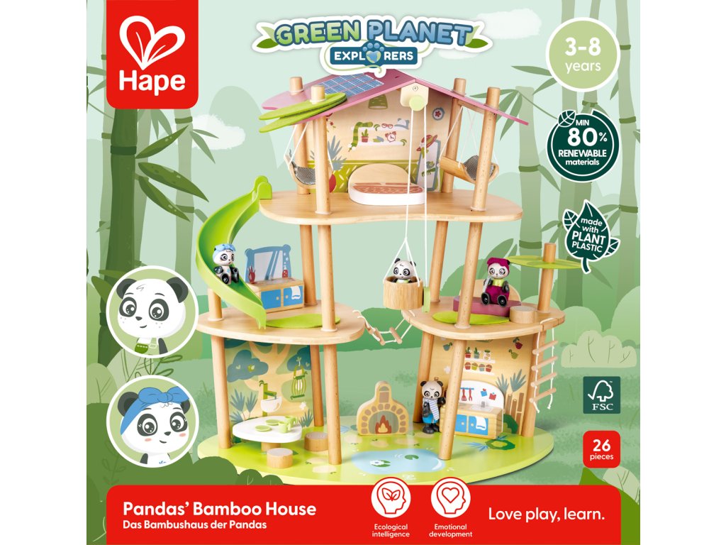 Bambusový domeček pro pandy. Tato sada z kolekce Green Planet Explorers je vyrobena z udržitelného bambusu a nabízí spoustu herních prvků – najdete v ní krb, houpací sítě, provazový žebřík, a dokonce i výtah. Společně s rodinkou čtyř pand strávíte nekonečné hodiny objevováním světa plného dobrodružství – a zároveň se zábavnou formou naučíte něco o udržitelnosti, když budete s pandí rodinou prozkoumávat divokou přírodu. Hračka podporuje rozvoj jemné motoriky, fantazie, kreativity, sociálních dovedností, a především znalostí o principech udržitelnosti. Sada obsahuje: domeček, čtyři figurky pandy, dvě houpací sítě, postel, toaletní stolek, pohovku, čajový stolek, dvě podlahové rohože, slunečník, stůl se dvěma pařezovými sedáky, krb, kamna, dva talíře, dva šálky, pánev, výtahový koš na provázku, visutý most, skluzavku a provazový žebřík. Domeček a postavy jsou vyrobeny z udržitelných materiálů, včetně bambusu, zeleného PE plastu a dřeva s certifikací FSC. Rozměry domečku: 61,2 x 59,4 x 34 cm. Rozměry balení: 60 x 61 x 10 cm. Věk: 4+