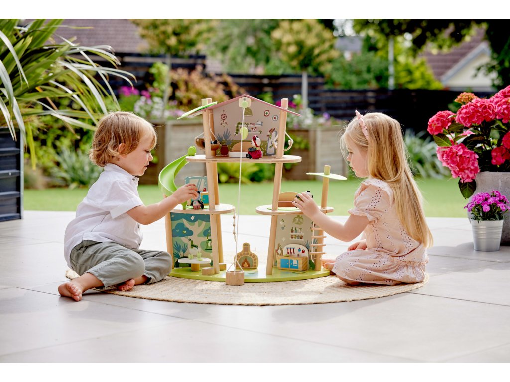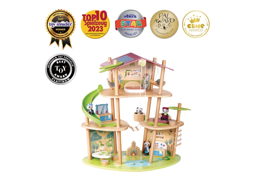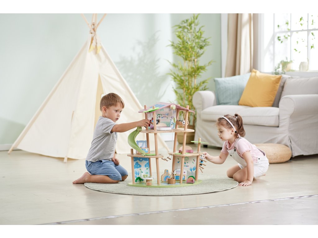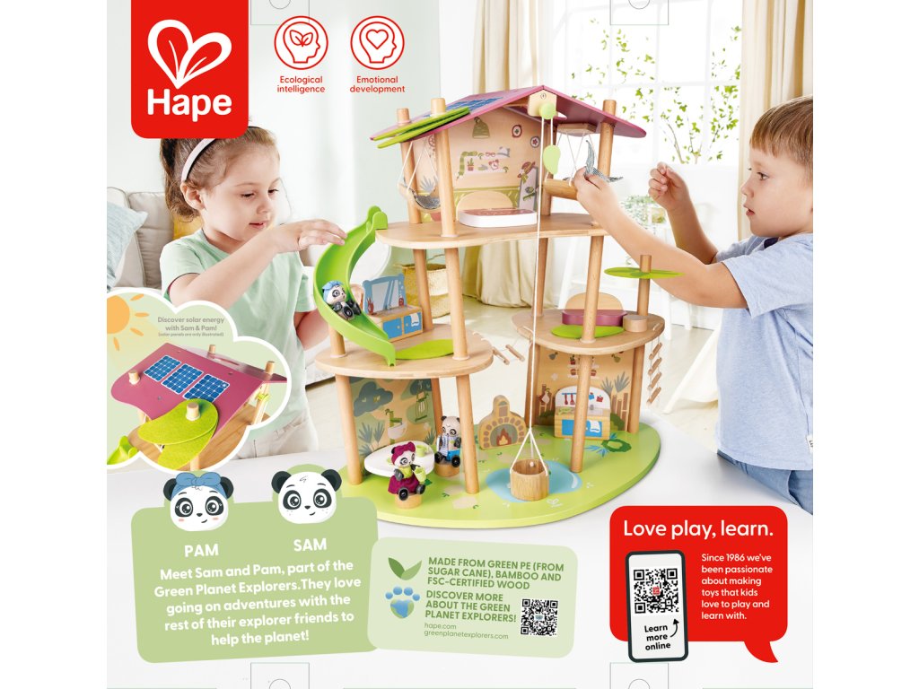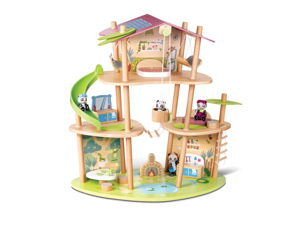 Bambusový domeček pro pandy. Tato sada z kolekce Green Planet Explorers je vyrobena z udržitelného bambusu a nabízí spoustu herních prvků – najdete v ní krb, houpací sítě, provazový žebřík, a dokonce i výtah. Společně s rodinkou čtyř pand strávíte nekonečné hodiny objevováním světa plného dobrodružství – a zároveň se zábavnou formou naučíte něco o udržitelnosti, když budete s pandí rodinou prozkoumávat divokou přírodu. Hračka podporuje rozvoj jemné motoriky, fantazie, kreativity, sociálních dovedností, a především znalostí o principech udržitelnosti. Sada obsahuje: domeček, čtyři figurky pandy, dvě houpací sítě, postel, toaletní stolek, pohovku, čajový stolek, dvě podlahové rohože, slunečník, stůl se dvěma pařezovými sedáky, krb, kamna, dva talíře, dva šálky, pánev, výtahový koš na provázku, visutý most, skluzavku a provazový žebřík. Domeček a postavy jsou vyrobeny z udržitelných materiálů, včetně bambusu, zeleného PE plastu a dřeva s certifikací FSC. Rozměry domečku: 61,2 x 59,4 x 34 cm. Rozměry balení: 60 x 61 x 10 cm. Věk: 4+