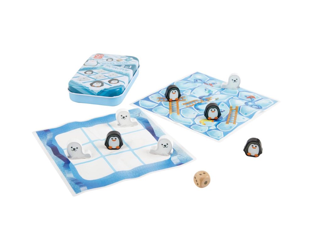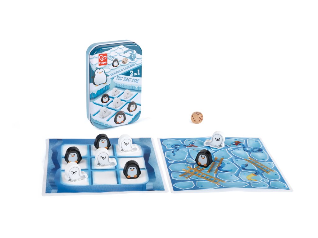Deskové hry. Hrací pole: Devítimístný herní plán, 8 figurek hráčů (4 tučňáci a 4 pečeti), kostky. Pravidla hry: Oba hráči hodí kostkou a hráč, který hodí nejvyšší číslo, jde jako první. Střídejte se a umístěte své figurky na palubu. Hráč, kterému se podaří umístit tři své figurky do vodorovné, svislé nebo diagonální řady, je vítězem. Hadi a žebříky Součásti, které se mají použít: Herní plán s hady, jeden dílek tučňáka, jeden dílek pečeti, jedna kostka Pravidla hry: Při hodu kostkou se střídejte. Hráč, který hodí nejvyšší číslo, jde jako první. Pohybujte svou figurkou po polích podle čísla, které jste hodili. Když přistanete na jejich základnách, můžete vylézt na vrchol žebříků, ale pokud přistanete na hadí hlavě, musíte sklouznout zpět dolů k jejímu ocasu. První hráč, který se dostane na konec, je vítěz! Balení: 13,2x2,7x8,5cm. Věk: 3+
